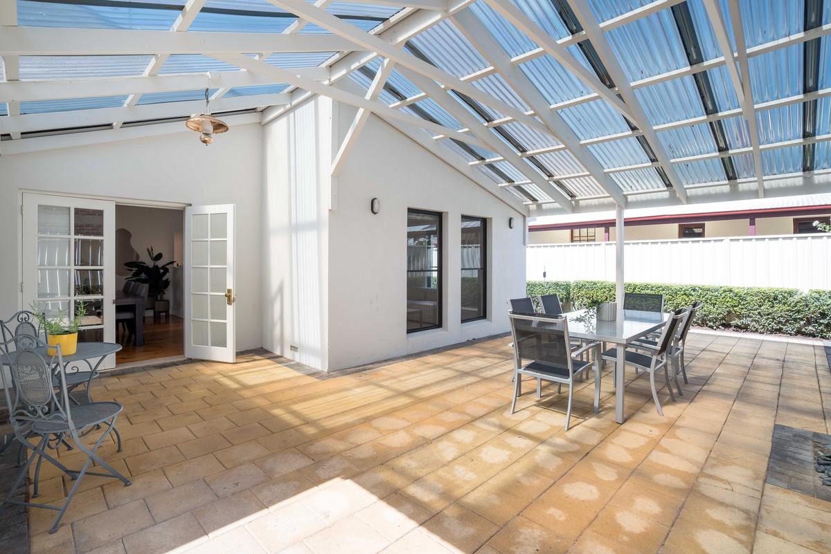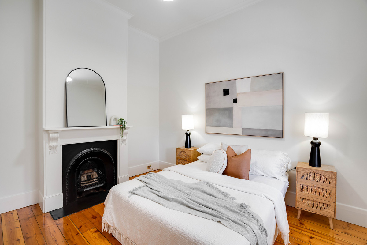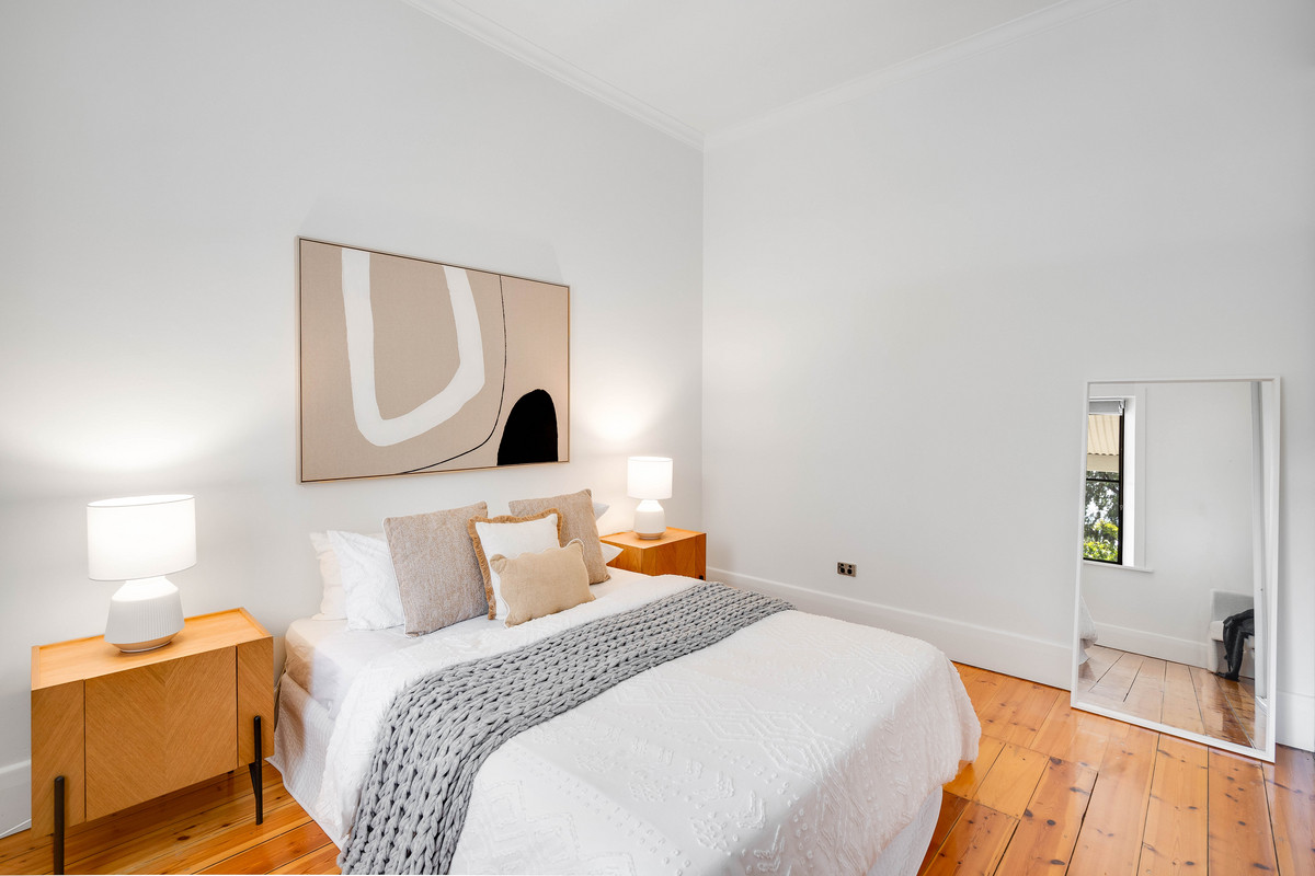 Inside, the villa showcases its original charm with stunning hardwood floors, high ceilings, and ornate fireplace mantles. The three generous bedrooms, all located at the front of the house, are equipped with built-in robes for convenient storage.