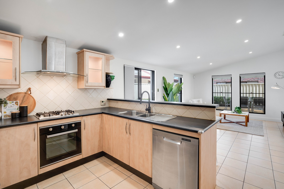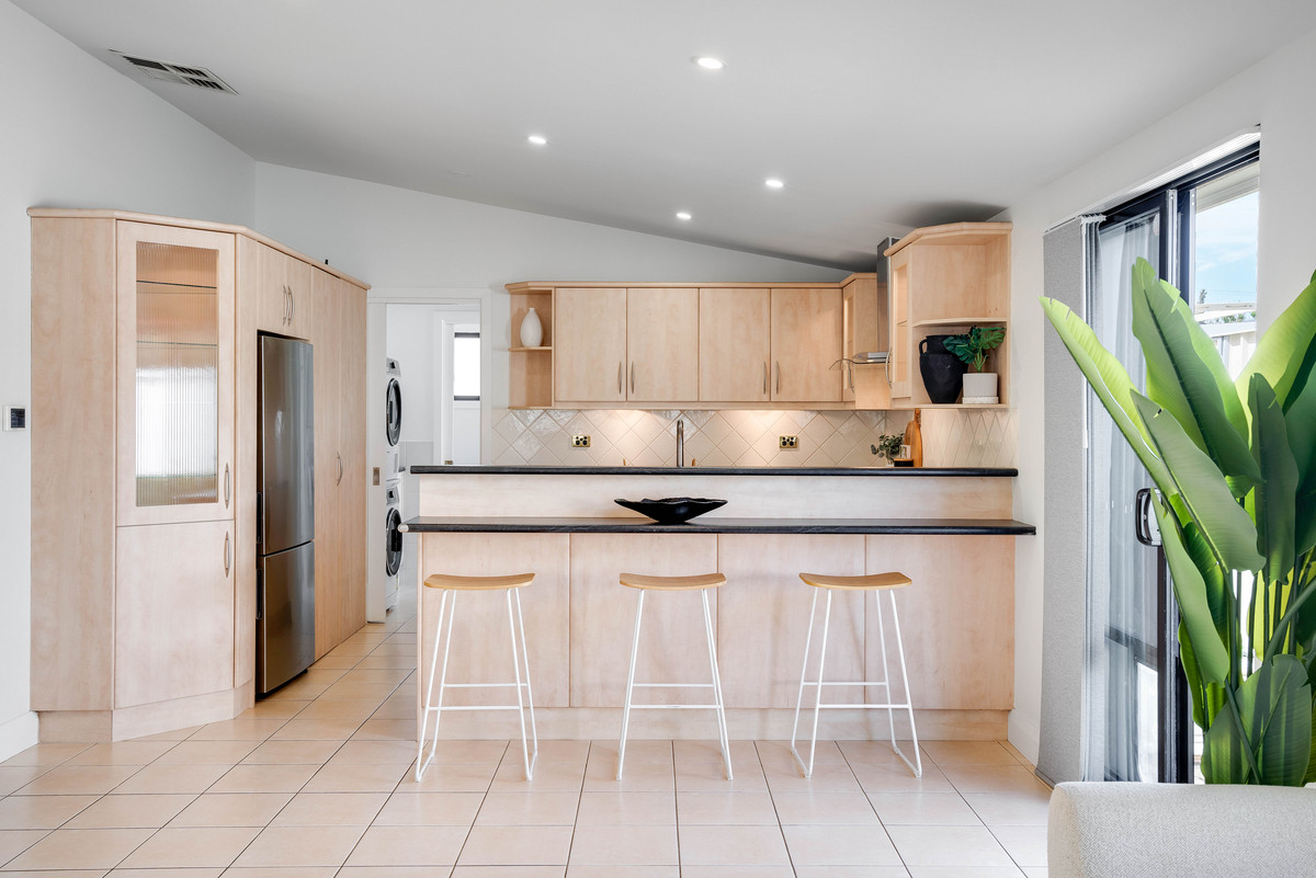 Continue through to the open plan kitchen and family room – a beautiful extension of the original home, drenched in natural light and featuring a vaulted ceiling for an airy feel. This spacious area is the perfect room for entertaining, complete with glass sliding doors to seamlessly invite the outdoors in.