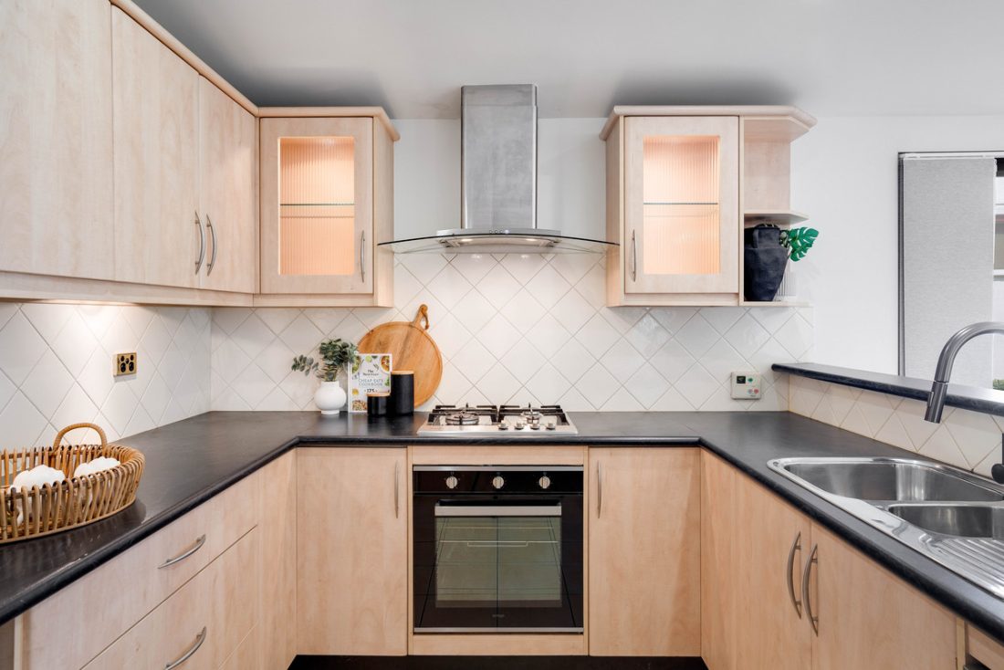 – Contemporary kitchen with ample storage, built-in lighting to cupboards, tiled backsplash and stainless steel appliances, including a gas cooktop and dishwasher