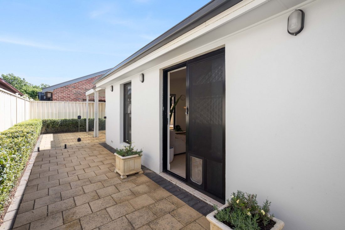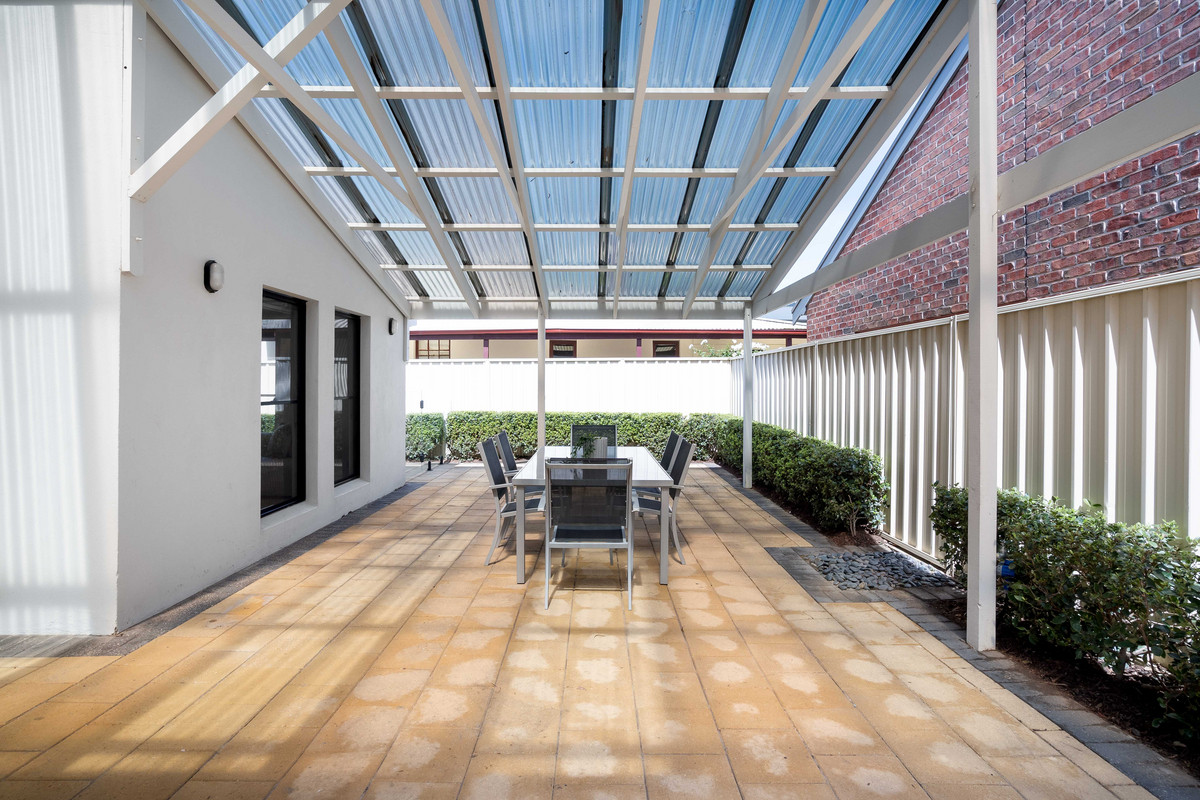 Step outside to an entertainer’s delight: an expansive paved area sheltered by a pitched verandah, perfect for year-round gatherings. Neatly trimmed hedges line the perimeter, adding a touch of greenery and charm.