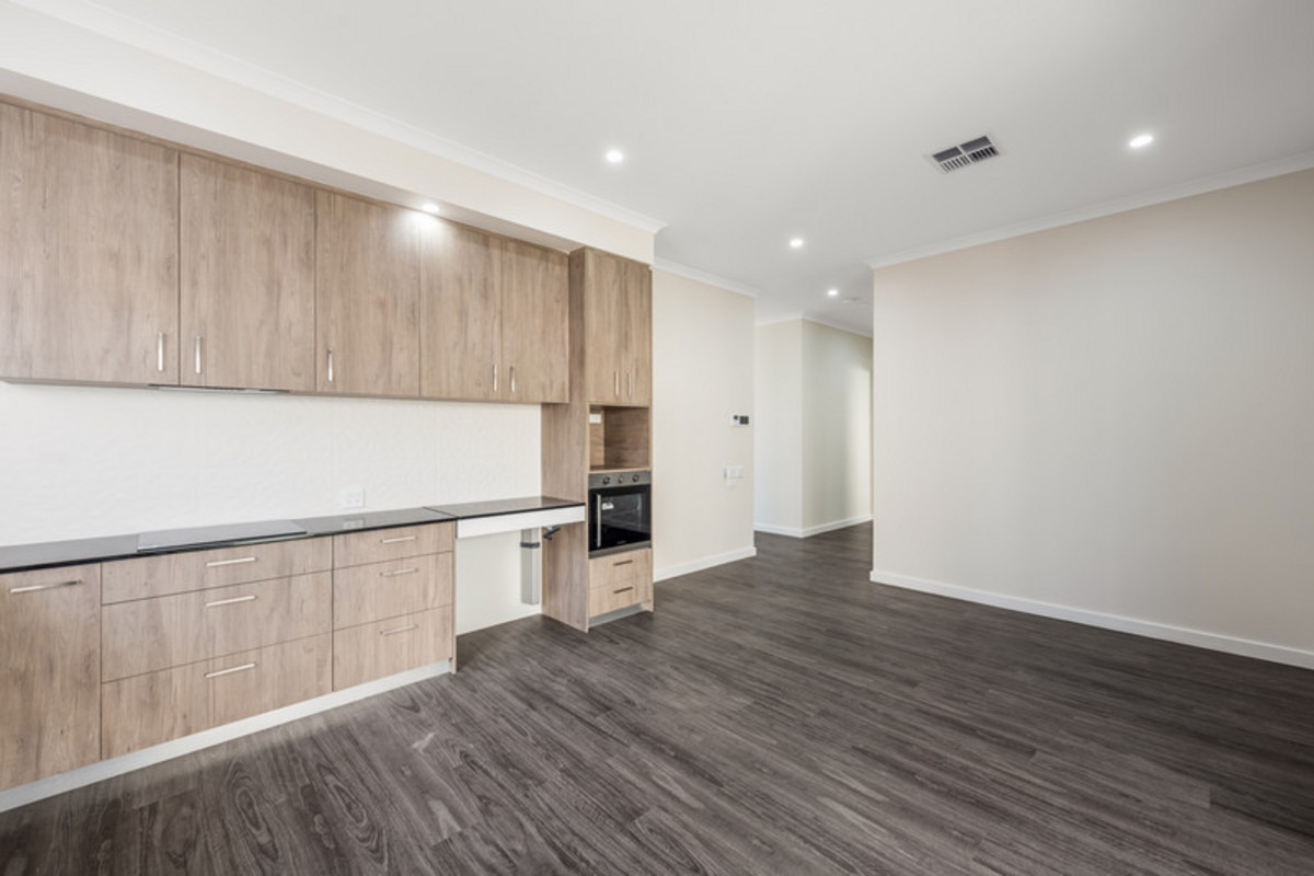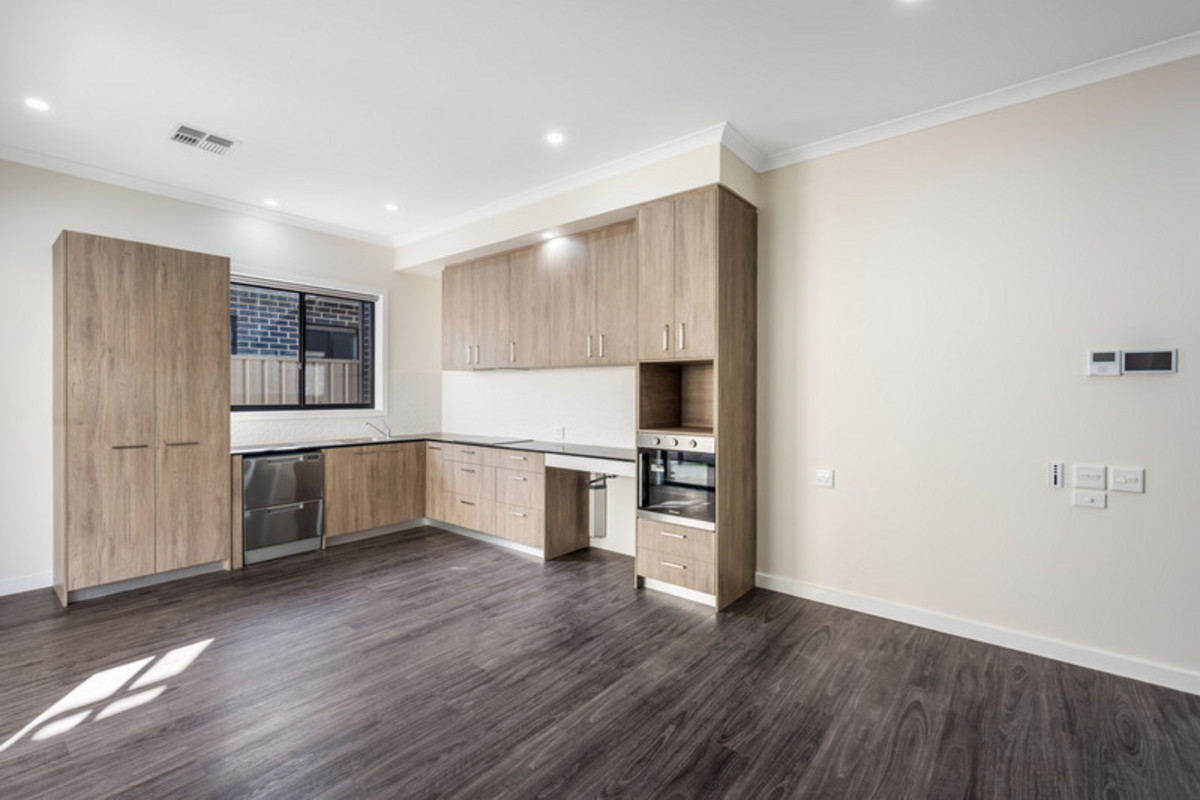 The central hub of the home is the light-filled kitchen, dining, and living area—an inviting space designed for shared connection. The kitchen is fitted with accessible appliances including an electric cooktop, wall-mounted oven, dishwasher, and generous cabinetry. Sliding doors open to a secure, low-maintenance backyard, giving residents a safe and enjoyable outdoor retreat.