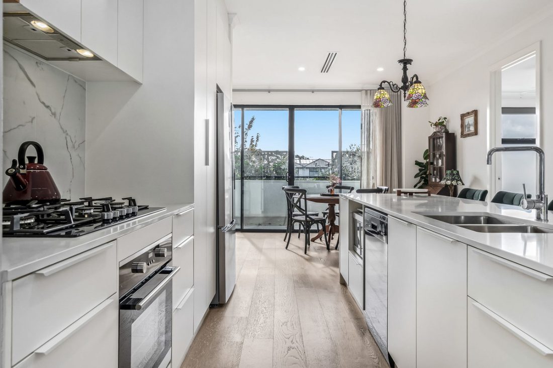 The kitchen is a standout, boasting stone bench tops, slimline sink with designer mixer, quality Euro stainless steel appliances including a dishwasher, and contemporary cabinetry – all combining to deliver a functional and visually striking space.