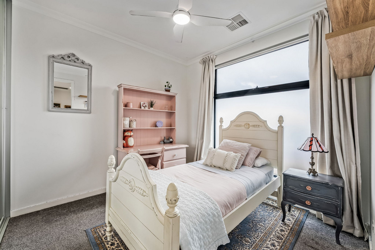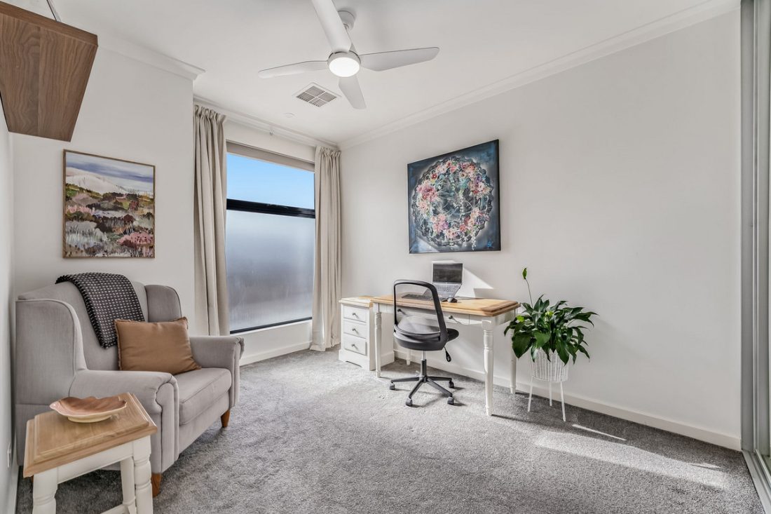 The master suite, conveniently located on the ground floor, offers a peaceful retreat complete with a generous walk-in robe, a beautifully appointed ensuite bathed in natural light, and glass sliding doors that open to a private courtyard – your own serene outdoor escape. A built-in study nook nearby makes working from home both stylish and practical.