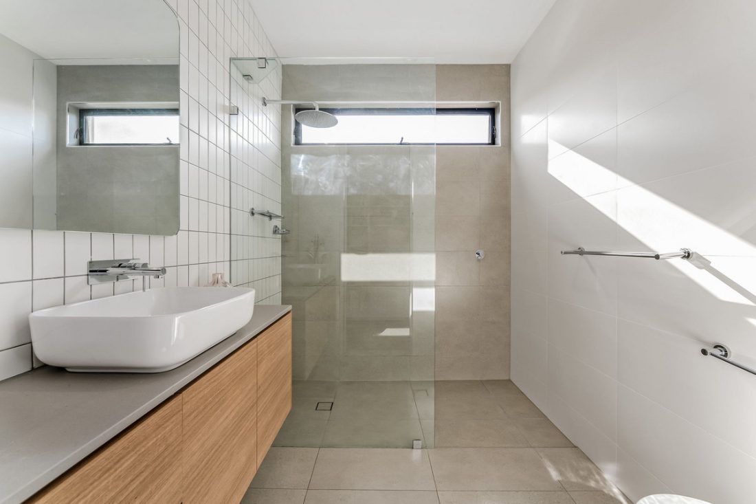 – Main bathroom upstairs with floor-to-ceiling tiles and stone bench tops