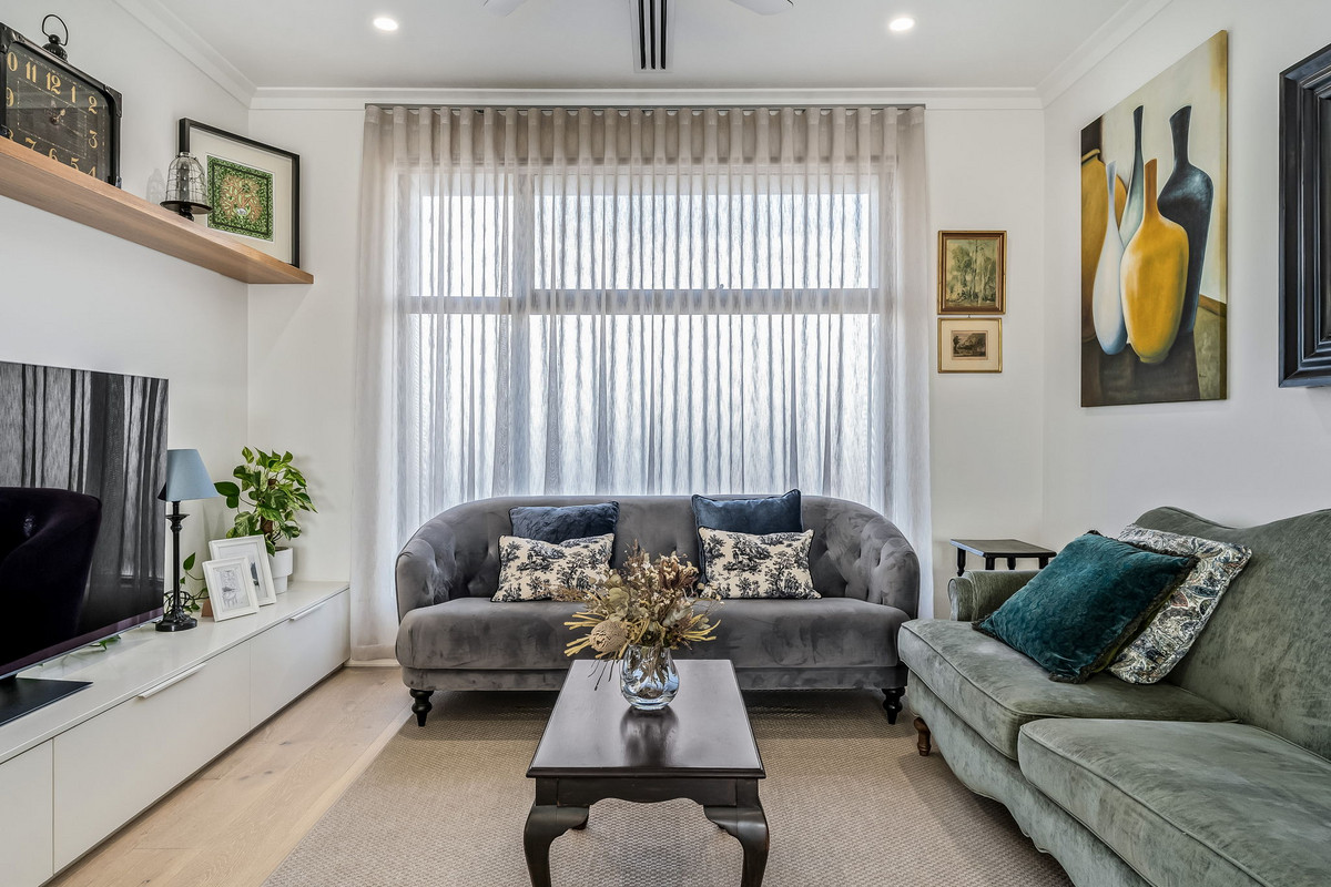 Showcasing an eye-catching cladded façade, the home immediately impresses with its spacious, light-filled interiors and warm timber flooring flowing through the main living areas. At the heart of the home, the open-plan kitchen, dining and living space is bathed in natural light, beautifully softened by sheer curtains that add warmth and elegance to the modern design.