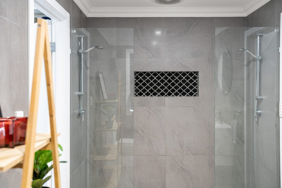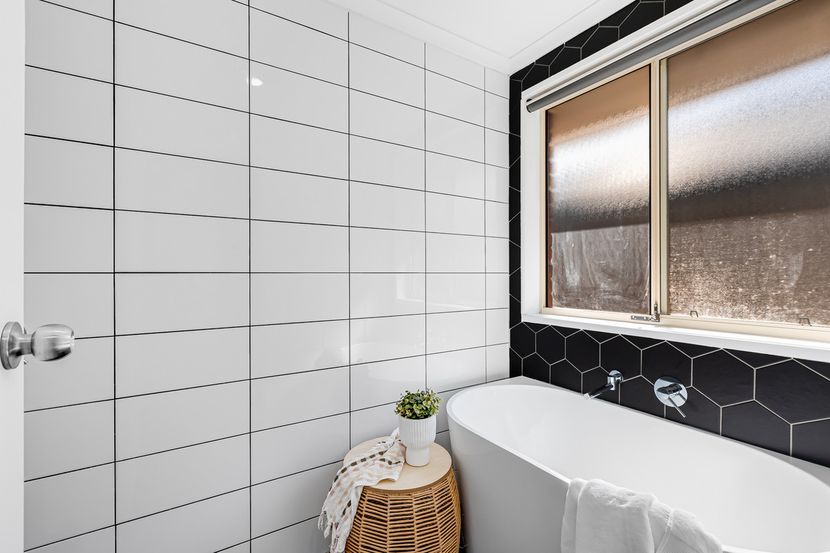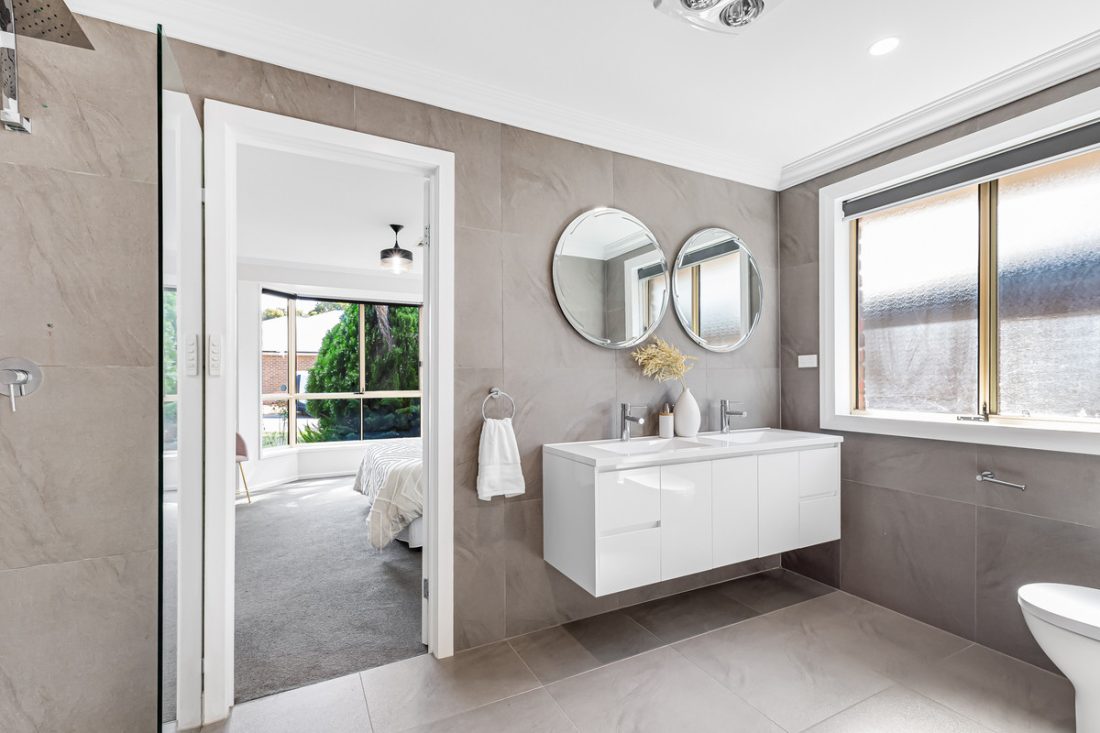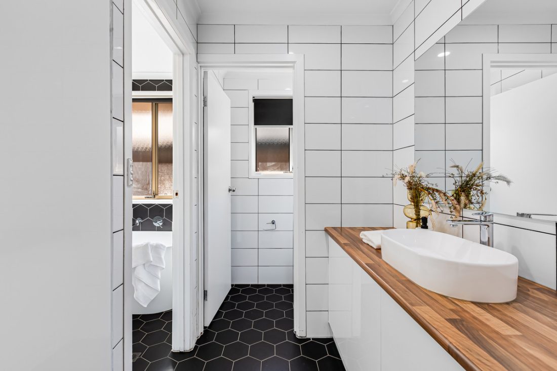 The renovated main bathroom is a sanctuary with floor-to-ceiling tiling and a free-standing bath. A separate vanity and WC provide added privacy for the household.