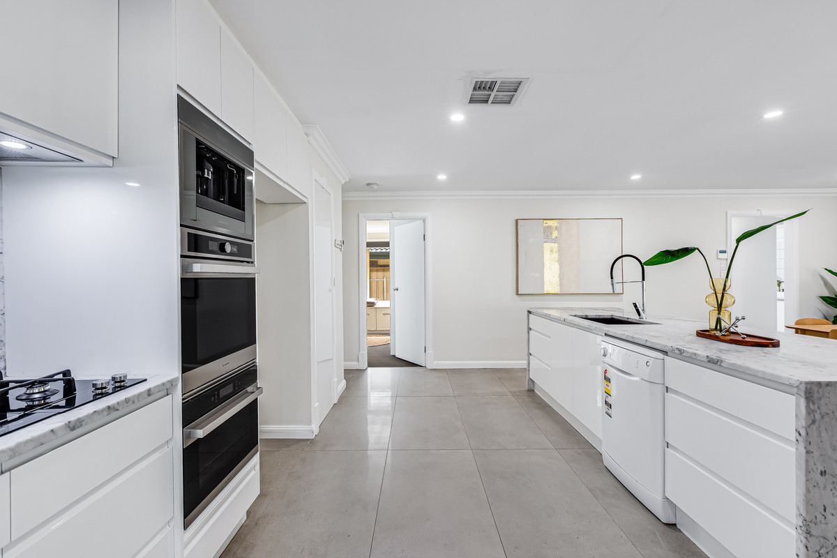 Step inside and be greeted by stylish tiled flooring that spans across the spacious layout, leading you into a front formal lounge area basking in natural light. The heart of the home is a modern kitchen adorned with marble benchtops, a walk-in pantry, Blanco sink, designer mixer, built in coffee machine and Ariston appliances, including two ovens. The open plan family/meals area features a bar, while an additional dining area is located just adjacent the kitchen area.