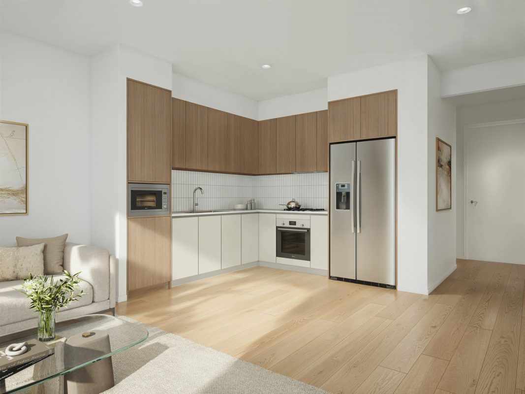 At the heart of the homes, the open plan living, dining, and kitchen spaces create a welcoming hub bathed in natural light. Timber-look flooring, LED downlights, and wide windows set the tone for effortless modern living. The kitchen combines form and function with engineered stone benchtops, stainless steel appliances, chrome tapware, a crisp white splashback, and ample cabinetry.