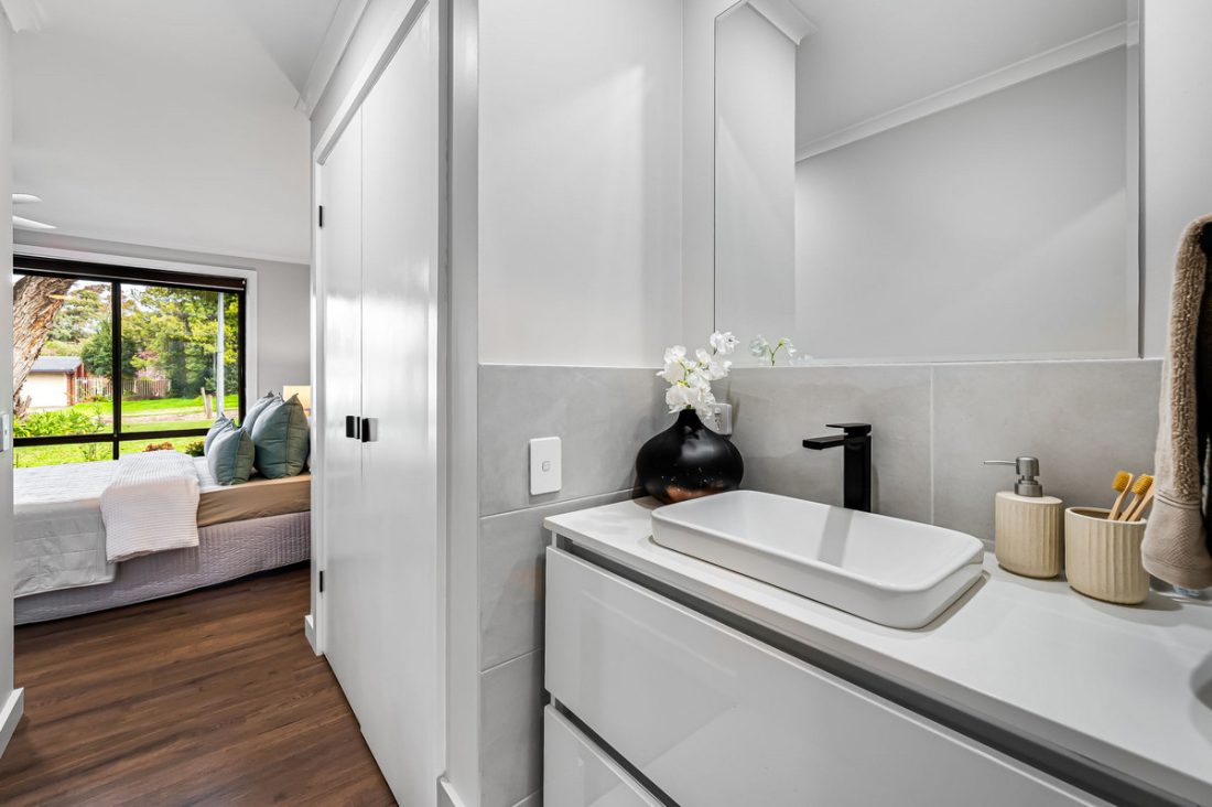 Discover three comfortable bedrooms with built-in robes and ceiling fans. The master bedroom includes a pristine ensuite, complete with floor-to-ceiling tiling, a sleek framed shower, and a modern vanity. The main bathroom mirrors these impeccable finishes, with the addition of a built-in bath for a relaxing soak.