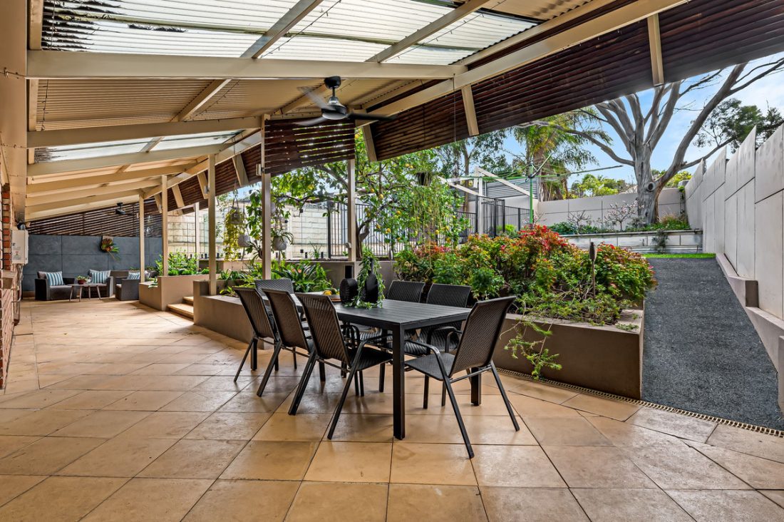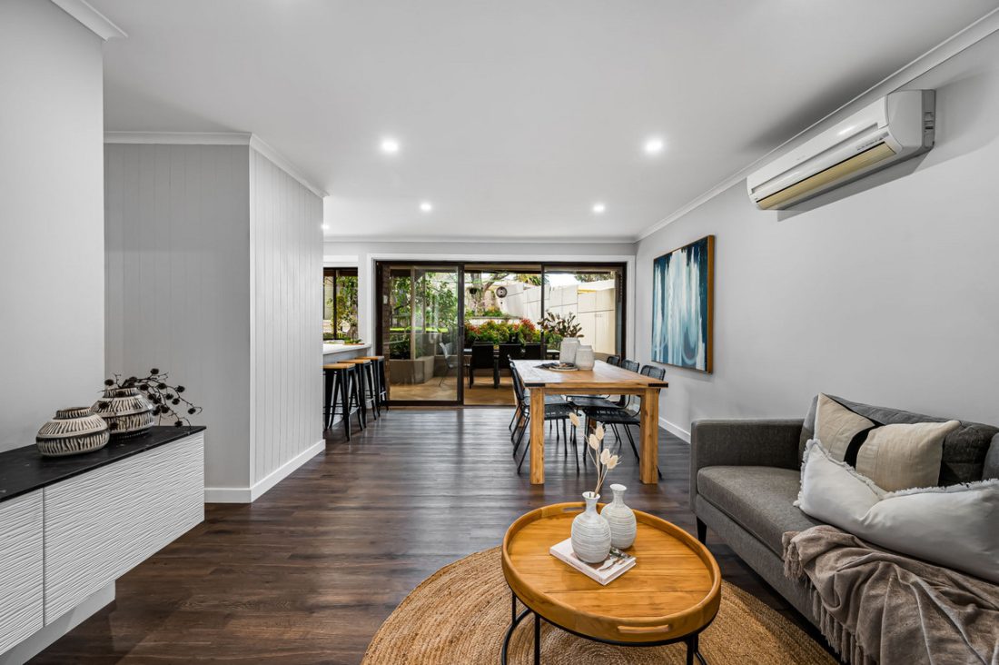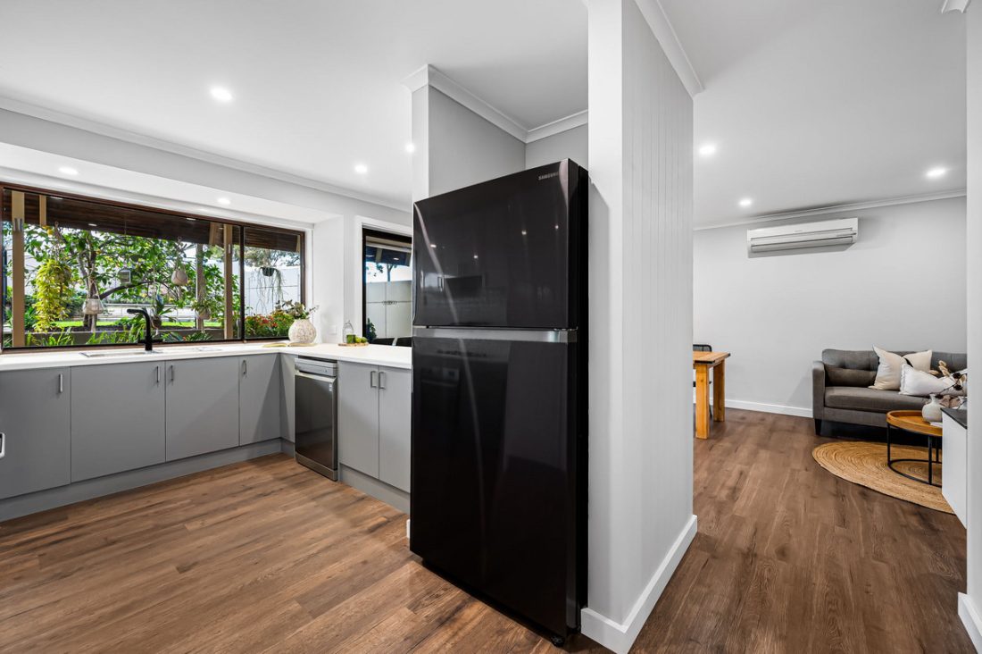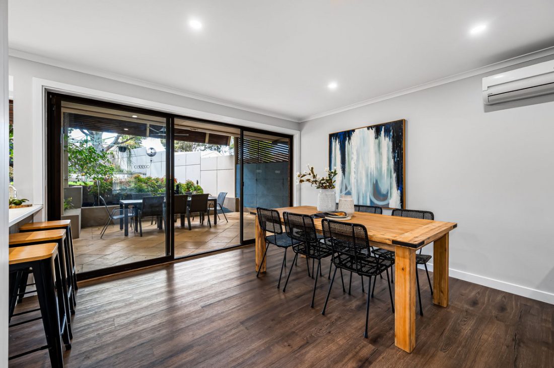 The heart of the home is the open-plan kitchen, meals, and living area, designed for everyday living and entertaining. The kitchen is beautifully renovated, featuring modern cabinetry, a subway-tiled backsplash, and sleek stainless steel appliances, including a gas cooktop and dishwasher.