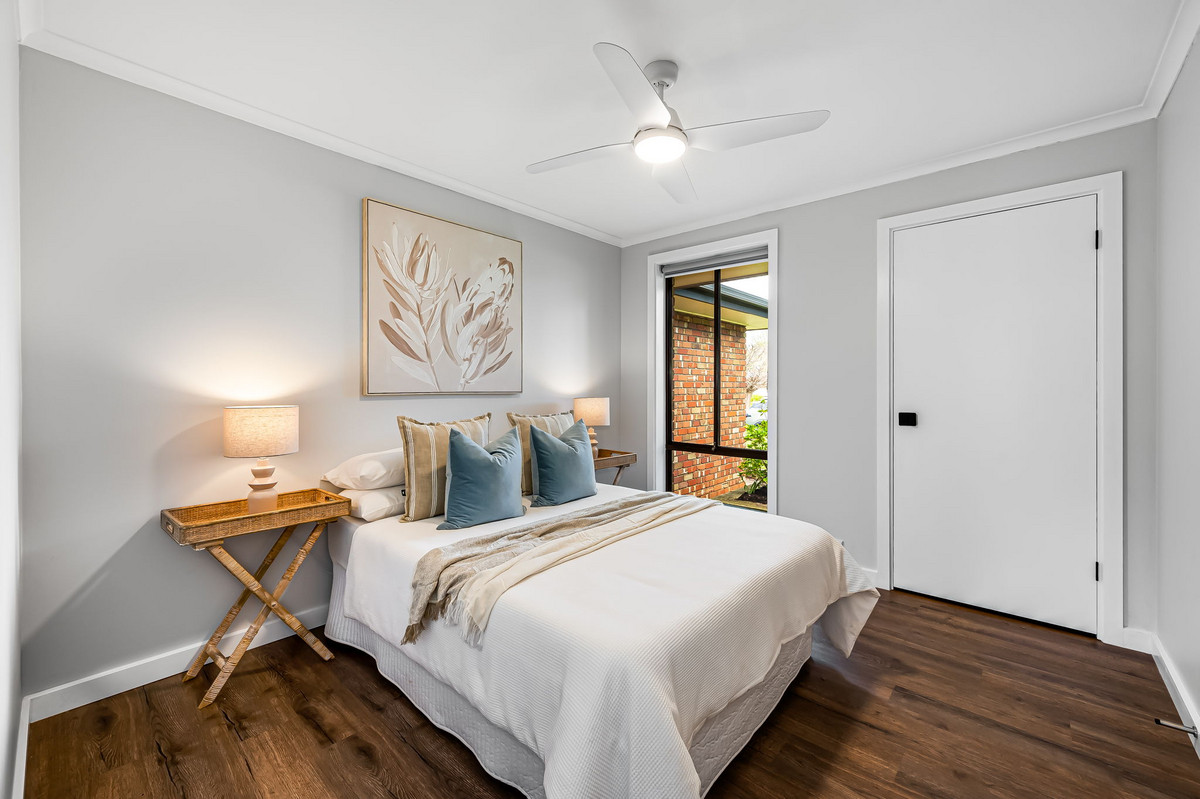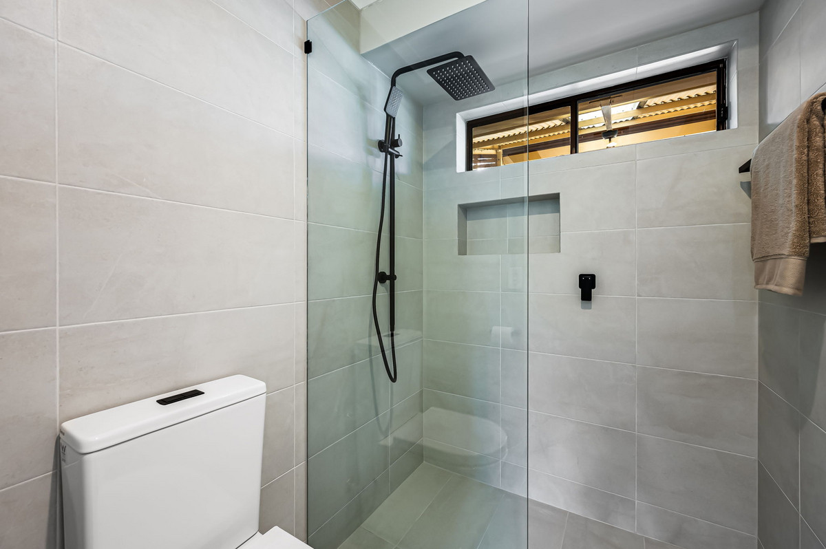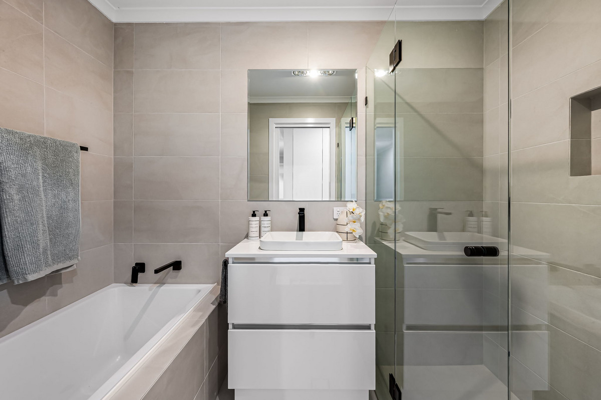Discover three comfortable bedrooms with built-in robes and ceiling fans. The master bedroom includes a pristine ensuite, complete with floor-to-ceiling tiling, a sleek framed shower, and a modern vanity. The main bathroom mirrors these impeccable finishes, with the addition of a built-in bath for a relaxing soak.