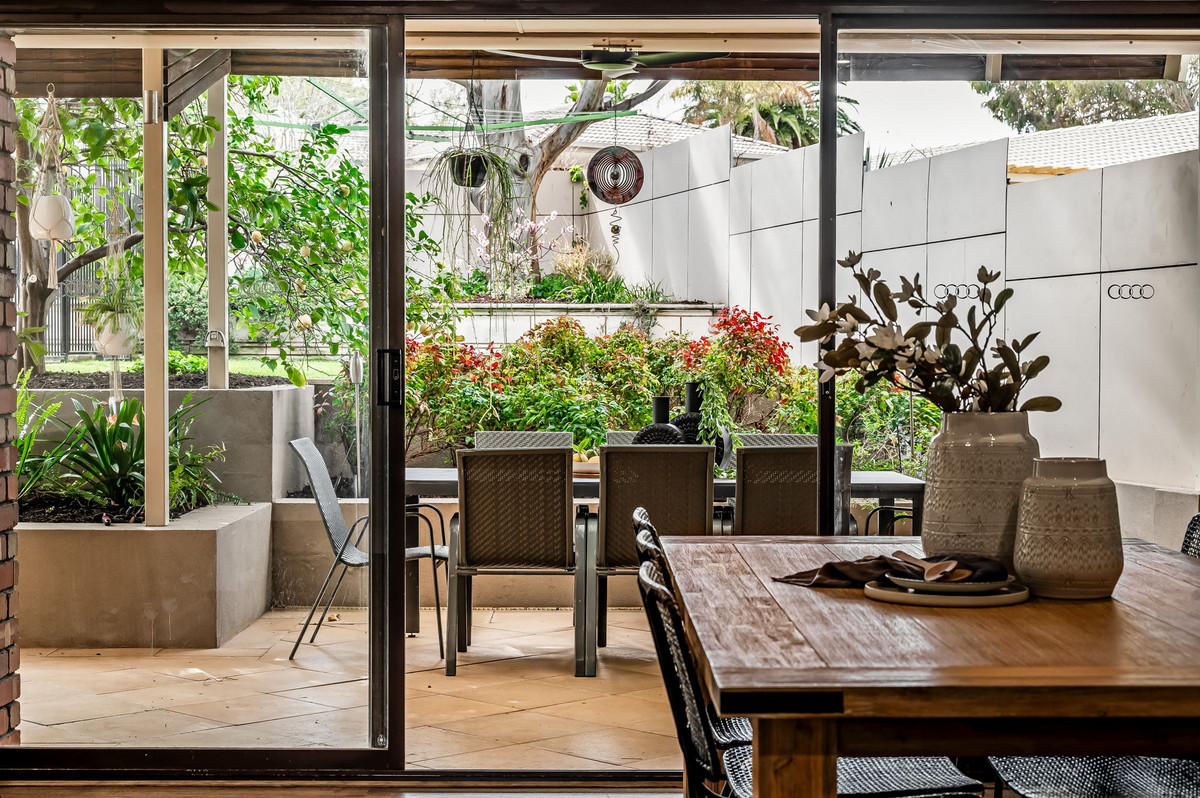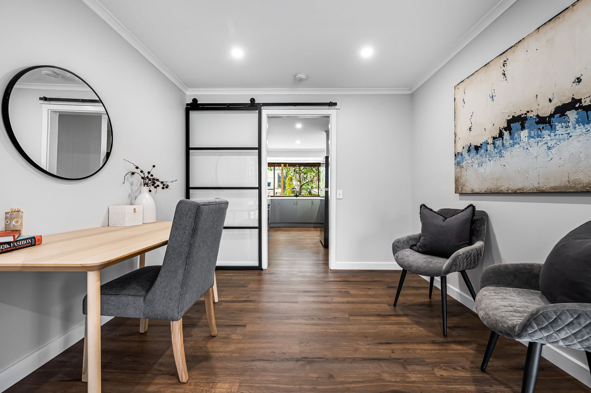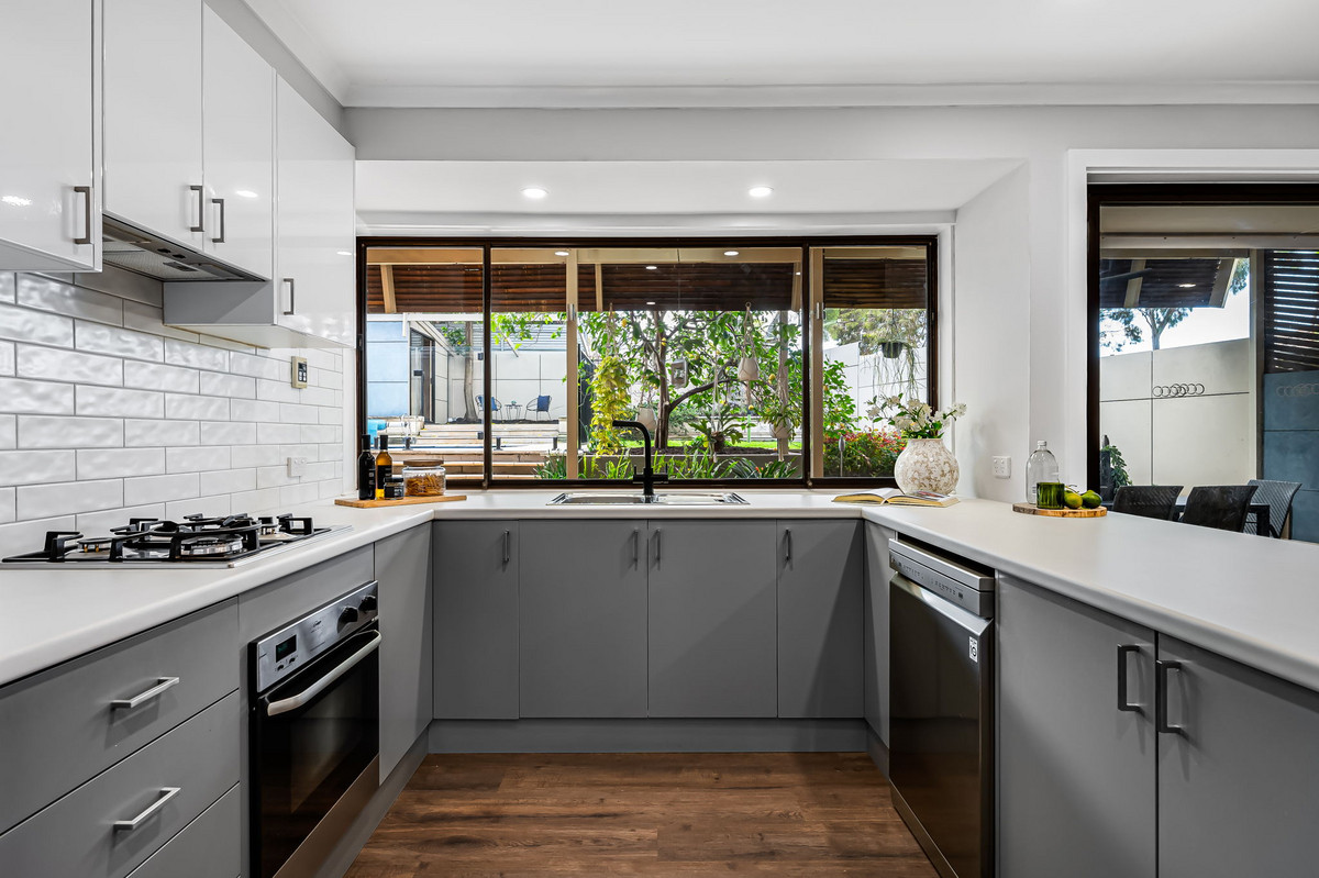 The heart of the home is the open-plan kitchen, meals, and living area, designed for everyday living and entertaining. The kitchen is beautifully renovated, featuring modern cabinetry, a subway-tiled backsplash, and sleek stainless steel appliances, including a gas cooktop and dishwasher.