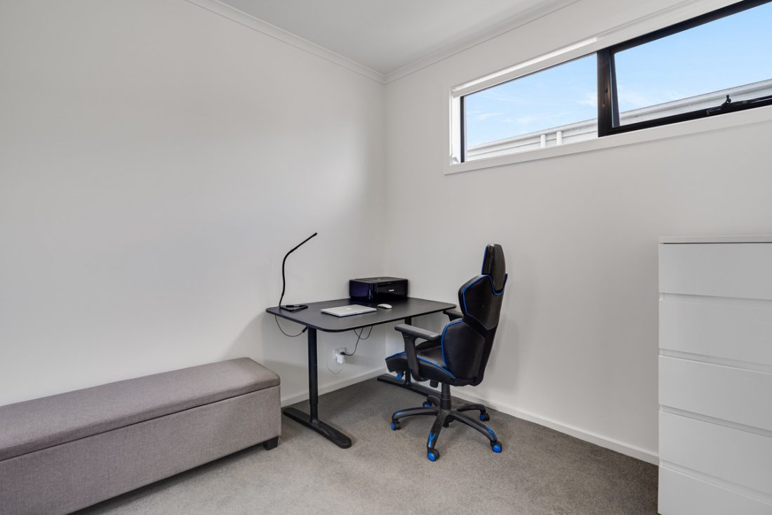 The heart of the home is a sleek, modern kitchen featuring a pristine white benchtop, induction cooktop, and stainless-steel appliances. Whether you’re preparing a casual meal or hosting a dinner party, this kitchen has you covered.