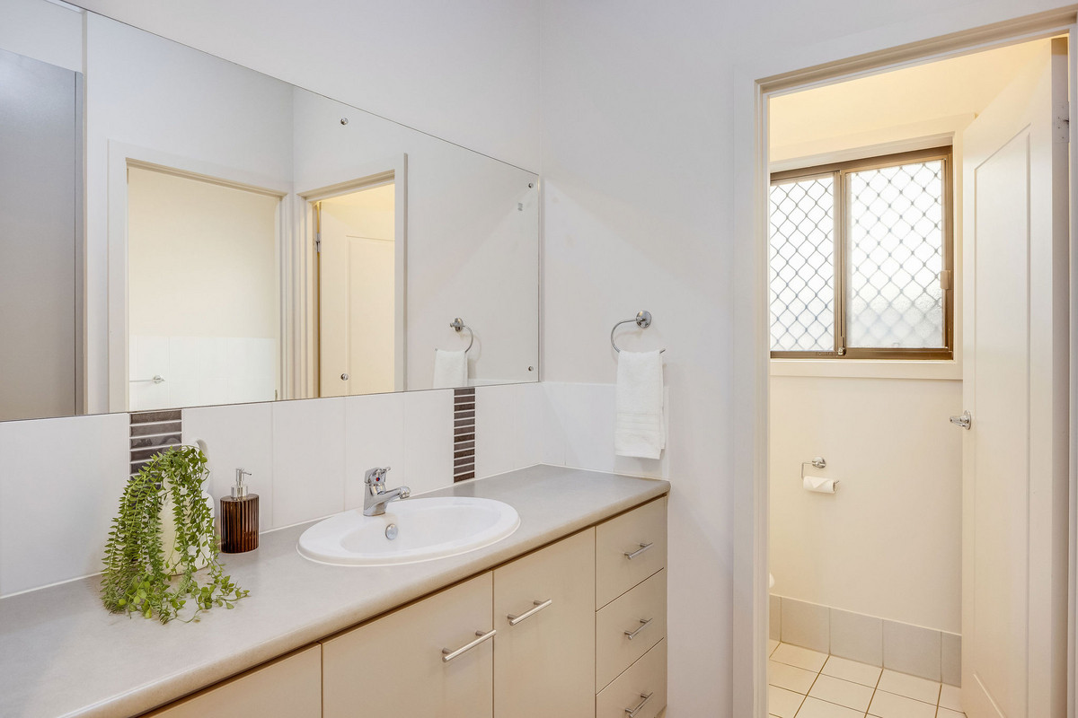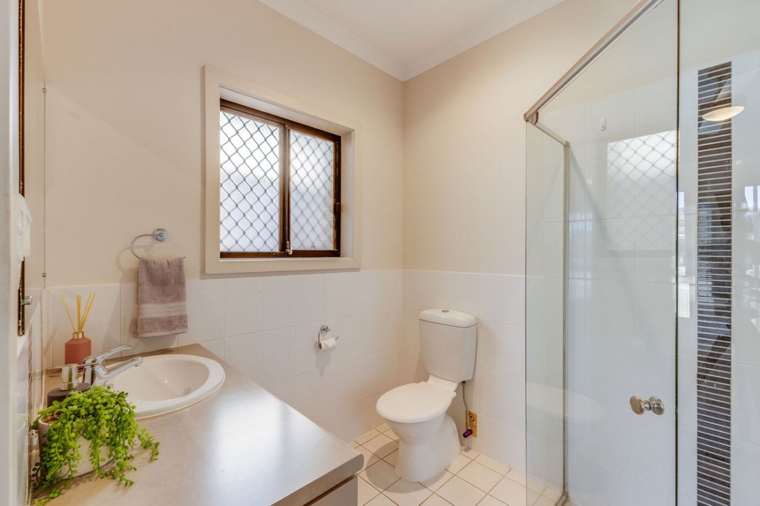 Both bathrooms are inviting, offering ample storage and abundant natural light. The main bathroom’s clever three-way design, complete with a separate toilet and bath/shower area, adds to the home’s practicality.