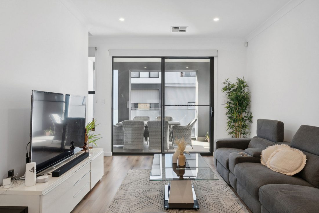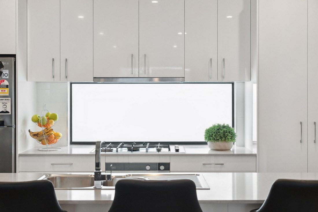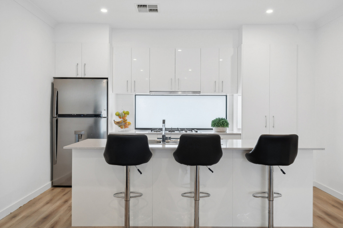 Ascending to the first floor, you enter the heart of the home: a spacious open-plan kitchen and living area bathed in natural light. The kitchen boasts sleek glossy cabinets and stainless-steel appliances, including a gas cooktop and dishwasher. An island bench with room for four bar stools creates the perfect setting for informal meals.