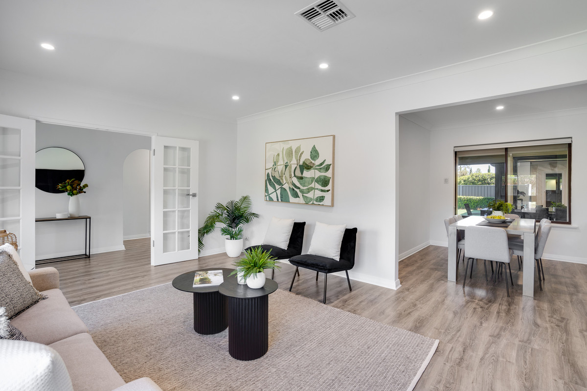 As you approach, the striking family facade welcomes you with its rendered finish, concreted pathways, lush turf, and a secure electric gate with intercom, setting the tone for the elegance within. Step into the large formal lounge room, bathed in natural light and adorned with timber-look floating flooring, creating a warm and inviting atmosphere.