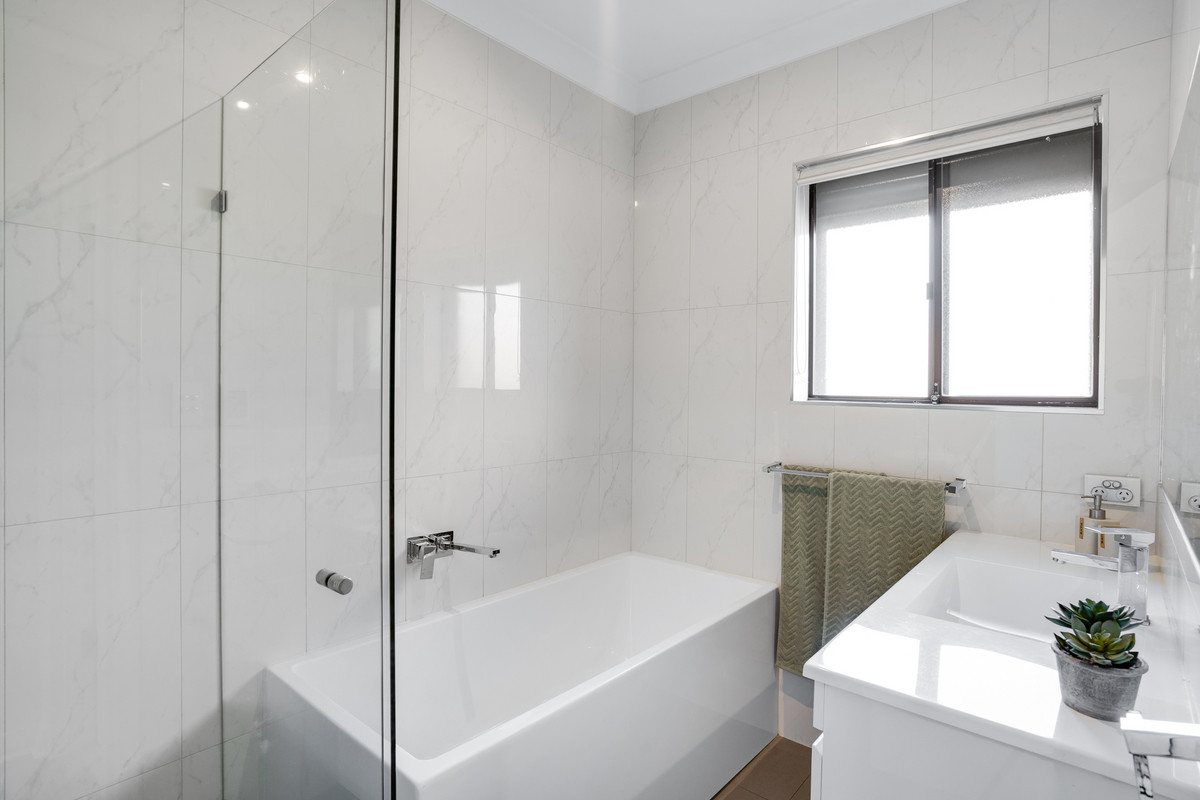 The spacious master suite is a haven of comfort, featuring a wide window, a large built-in robe, and a private ensuite. Two additional bedrooms, adorned with timber-look floating floors and built-in robes, provide ample space for family members or guests. A refreshed main bathroom boasts floor-to-ceiling white tiling and a built-in bath, exuding a sense of luxury.