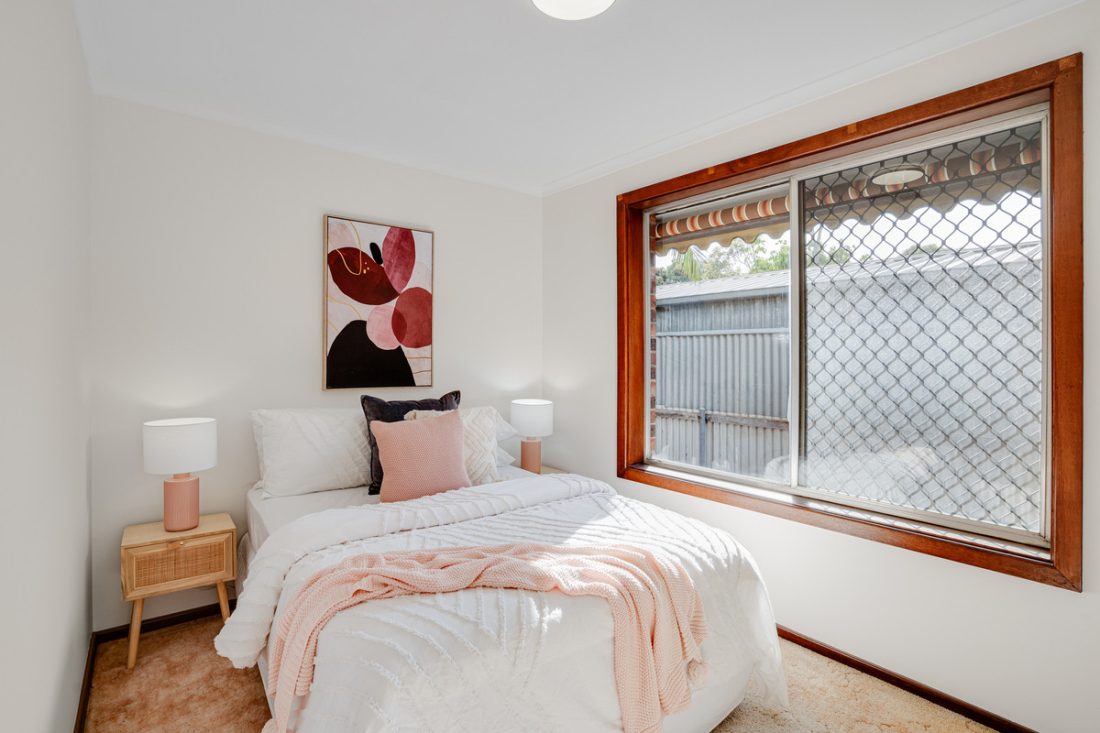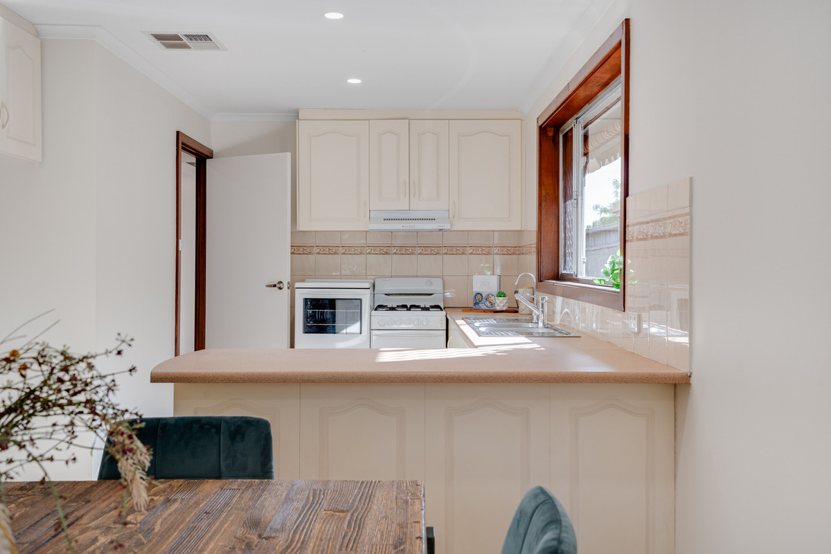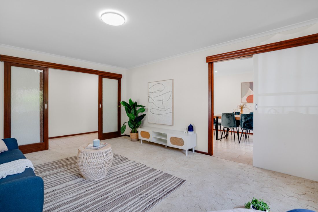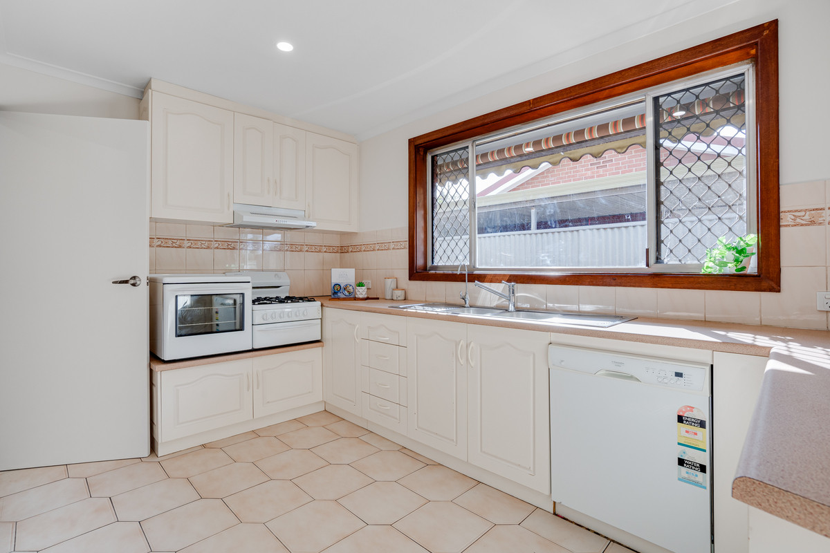 Access the front door through the undercover veranda adorned with retro tiled flooring, adding a touch of security and character to the overall home. Stepping inside you’ll be greeted by the living room, accessible through glass sliding doors, creating a perfect space for relaxation and unwinding. Flooded with natural light and plush carpeted flooring, this area exudes a sense of cosiness. A wide doorway effortlessly connects the living area to the adjacent dining and kitchen space. The kitchen, in pristine condition, offers a gas cooktop, oven, dishwasher, ample bench and cupboard space.