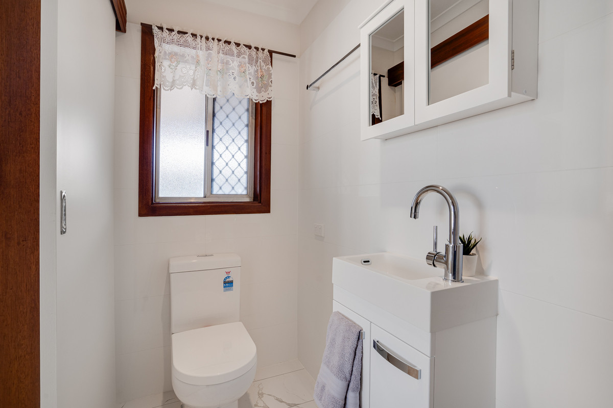 The newly renovated main bathroom features crisp white tiles, a shower and bathtub, and a contemporary vanity. To enhance usability, the toilet is in a separate space, ensuring an ideal layout for all. The strategically located laundry offers direct access to the backyard, adding to the home’s overall practicality.
