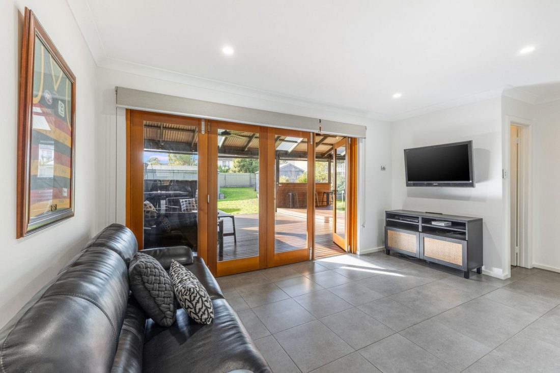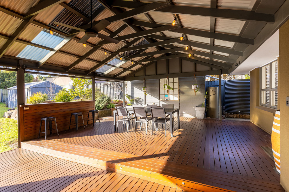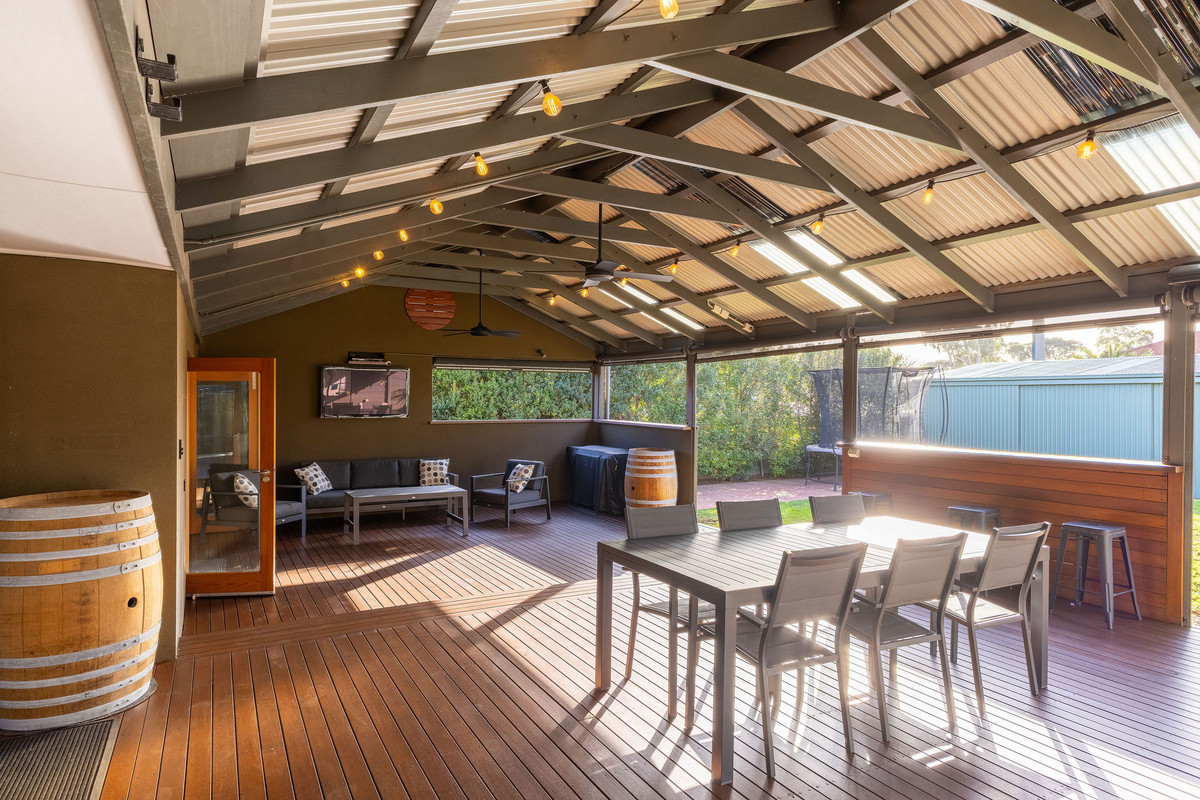 Out the back is where the magic really happens—a fully decked entertaining zone under an expansive pitched pergola, semi-enclosed with pull-down blinds and ceiling fans for all-seasons enjoyment.