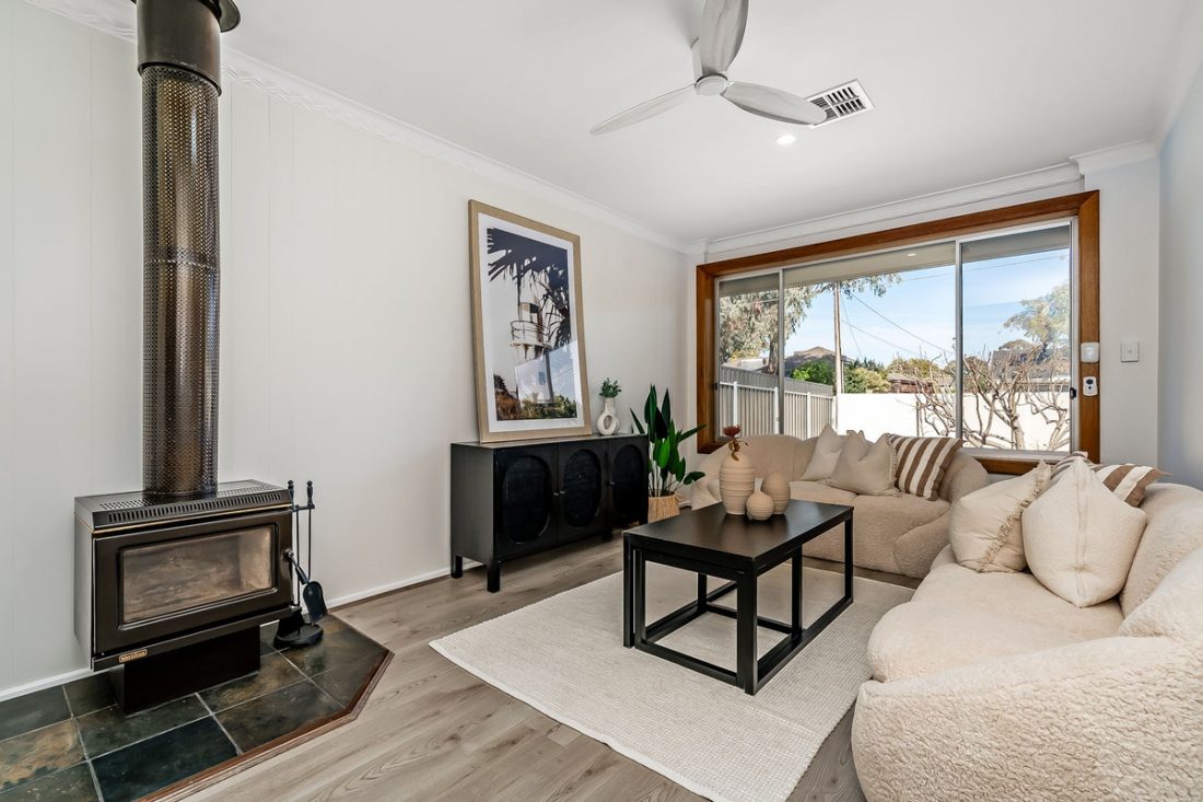 Step inside to the welcoming front lounge, where newly installed flooring, a cozy combustion stove heater, ceiling fan, and abundant natural light create a warm and inviting atmosphere.