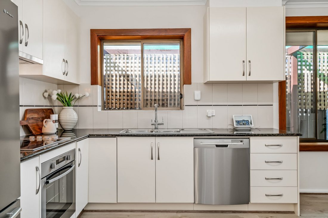 Continue to the open-plan kitchen and dining area, designed to foster connectivity during cooking and entertaining. The kitchen boasts modern cabinetry, a tiled backsplash, a double sink, and stainless steel appliances, including a dishwasher, complemented by a large window above the sink that fills the space with natural light.