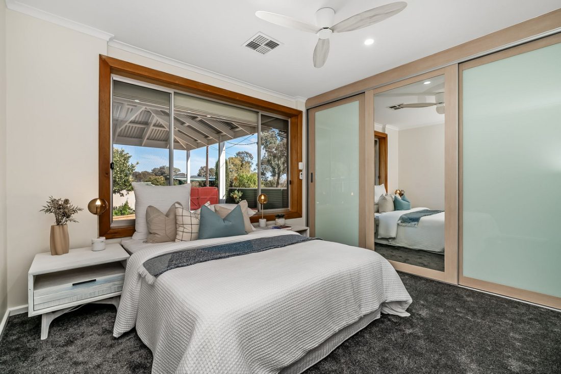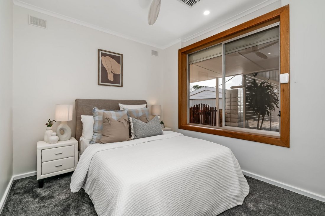 Discover three comfortable bedrooms, each featuring newly installed plush carpet, ceiling fans, and large windows that let in plenty of natural light. The main bedroom offers wall-to-wall built-in robes for effortless storage.
