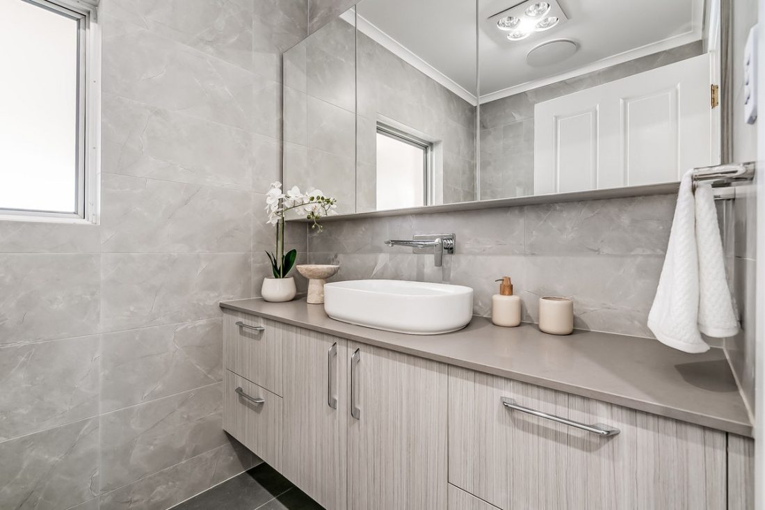 The renovated main bathroom provides a spa-like experience, complete with a modern floating vanity, floor-to-ceiling tiling, mirrored wall storage, a large shower, and a separate toilet.