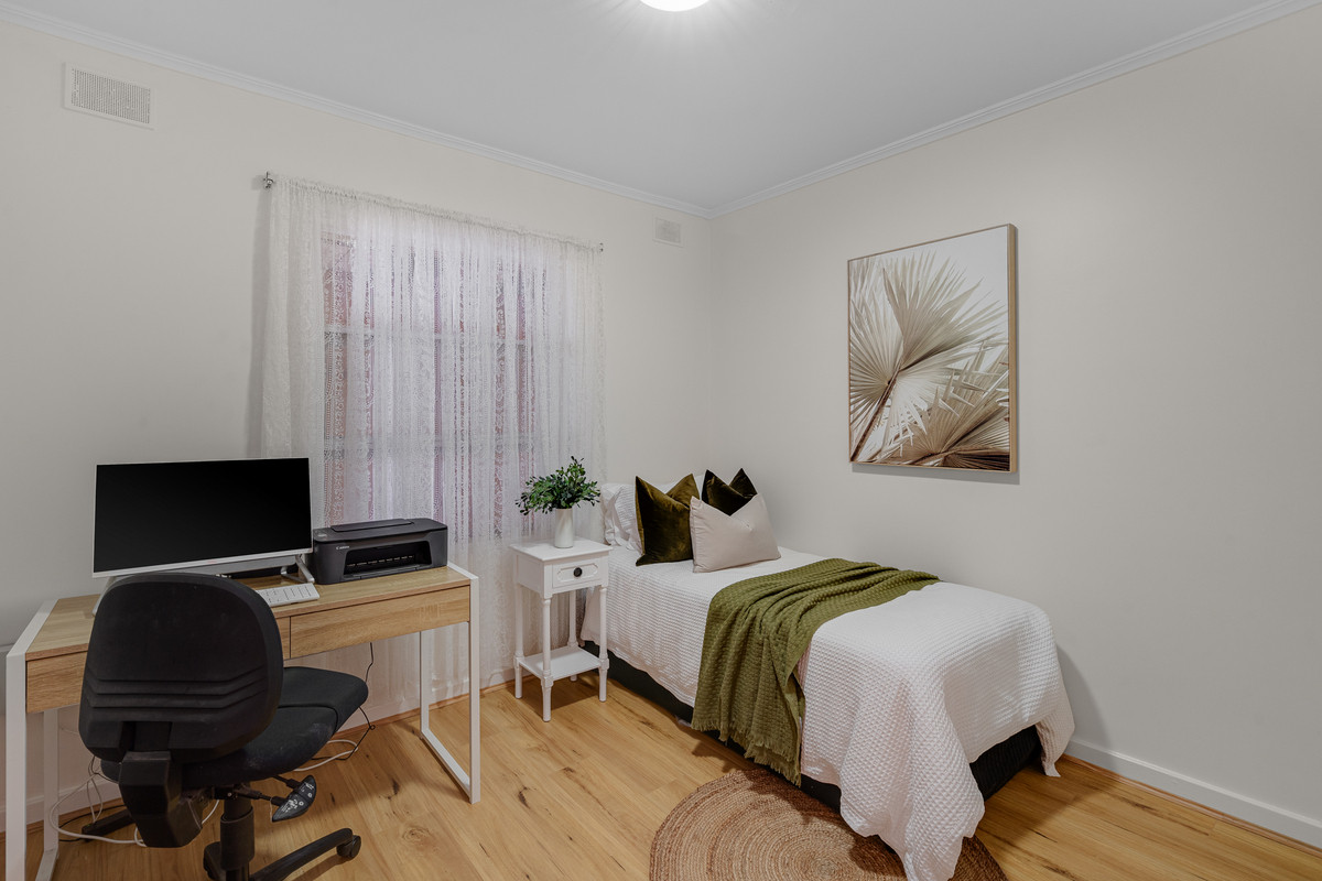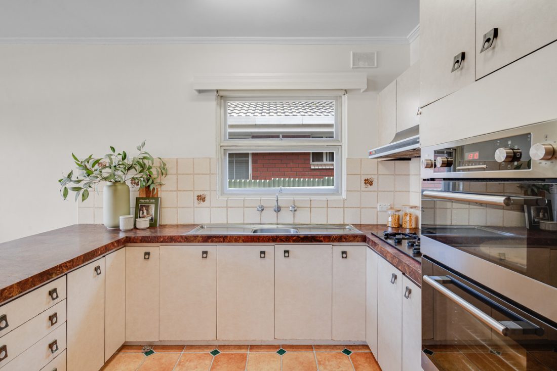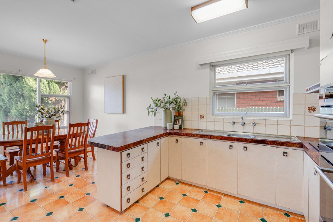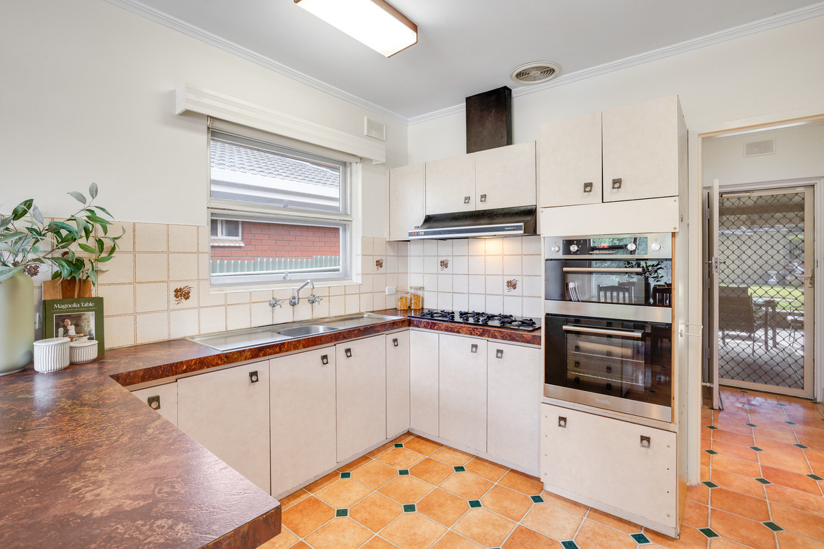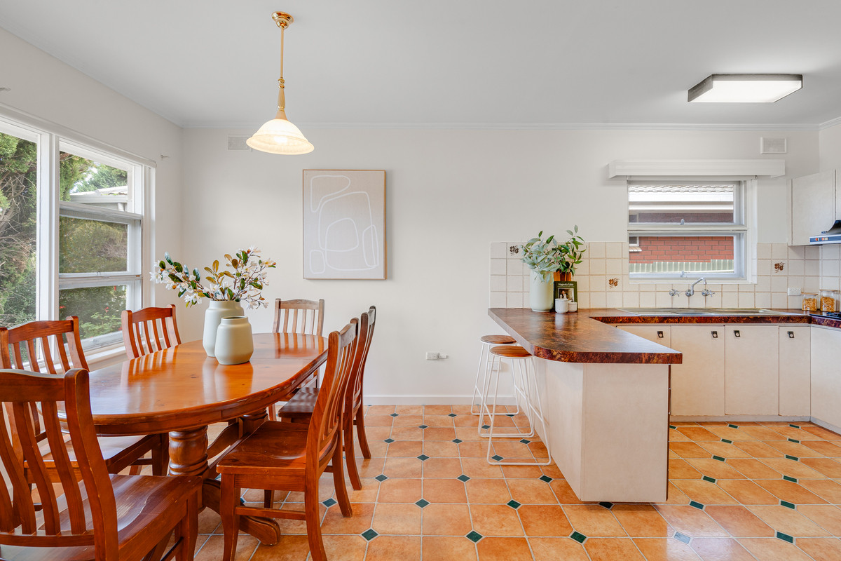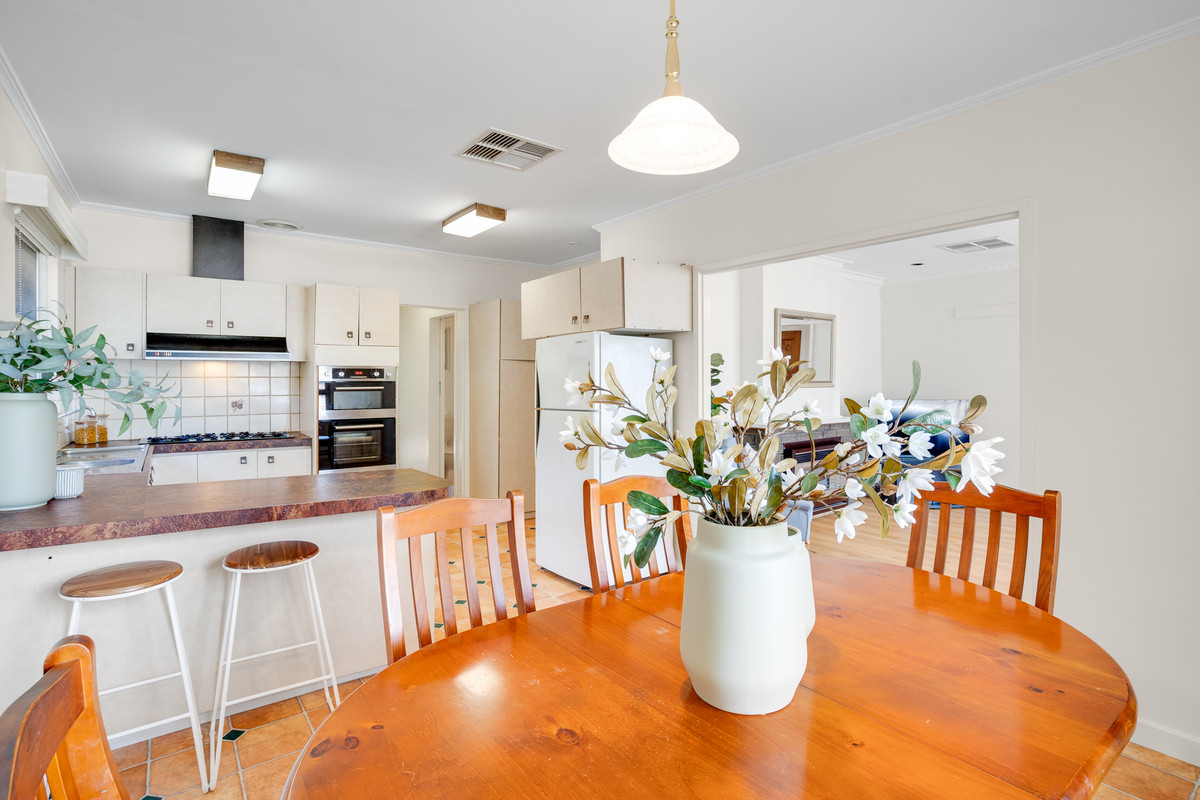 Continue through to the kitchen and dining area, a delightful and well-maintained space with leafy views of the yard. The charming and quaint kitchen features a tiled splash-back, gas cooktop, wall oven, and an abundance of cabinetry, offering both functionality and style.