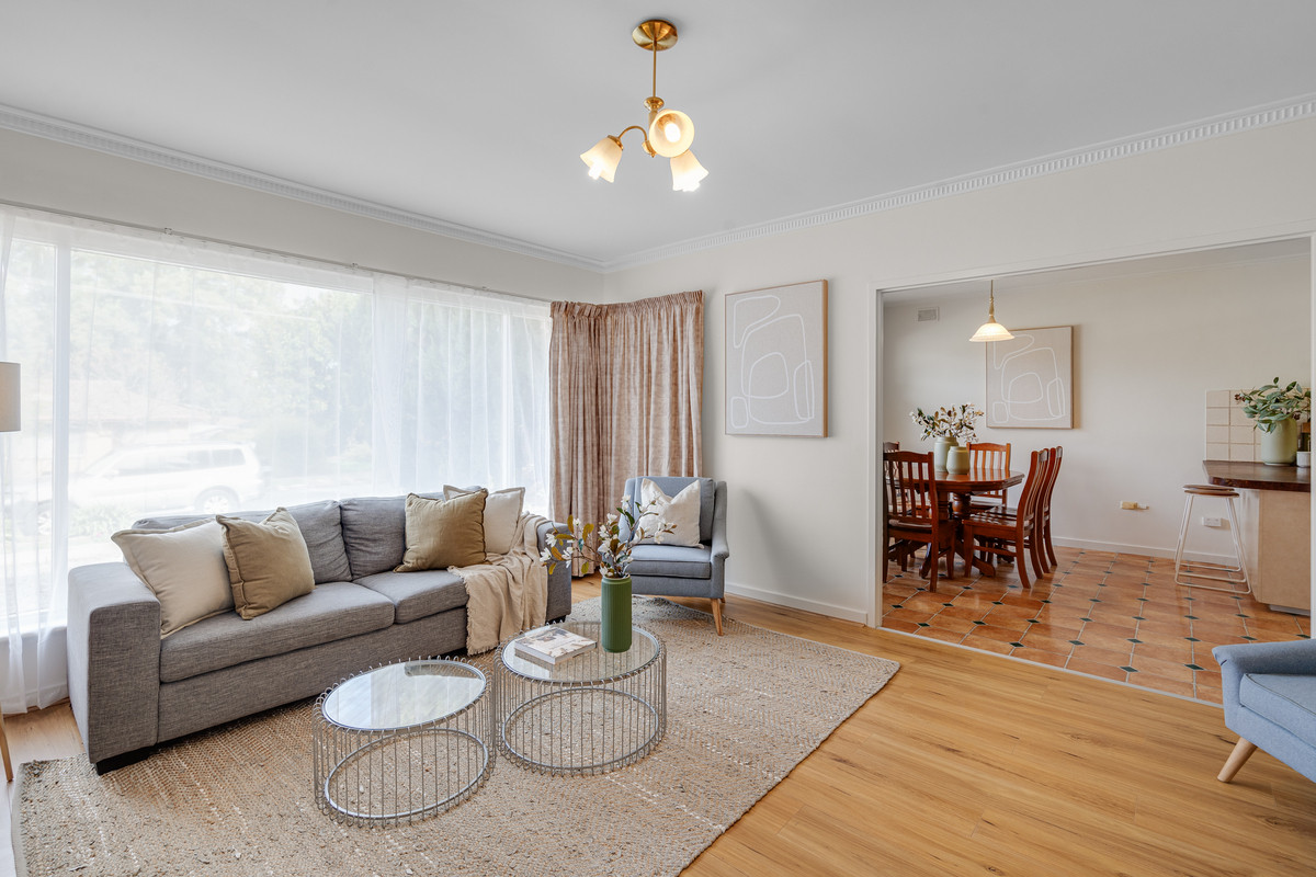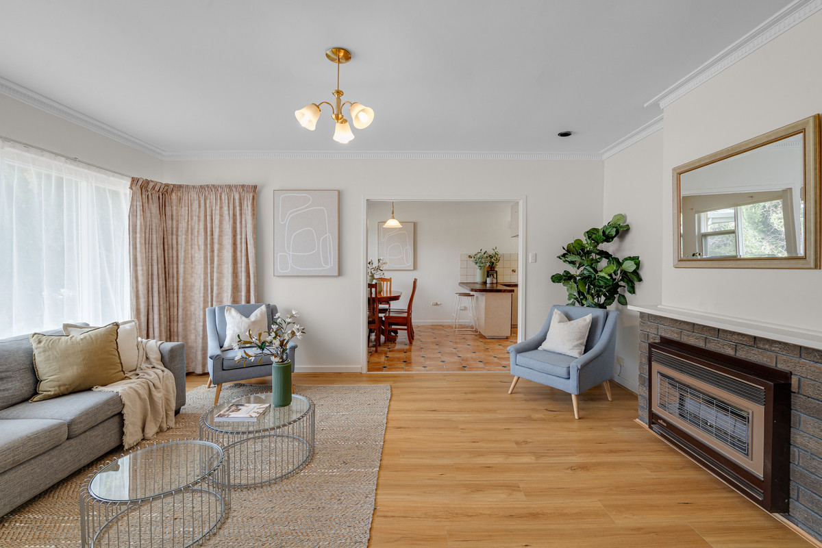 Step inside and be greeted by the front living room. This cozy space is perfect for intimate gatherings, bathed in natural light and complete with a gas heater, perfect for keeping warm during winter.