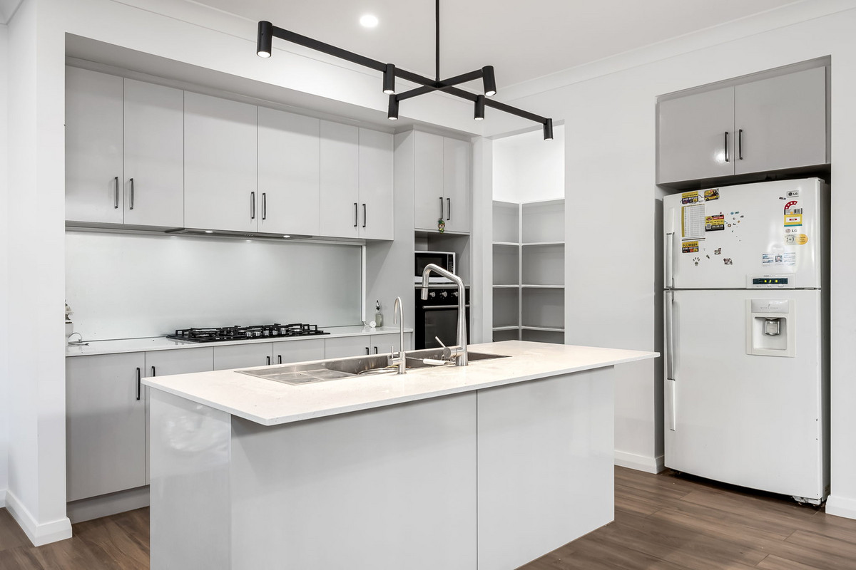 – Stylish kitchen with sleek cabinetry, island bench, walk-in pantry, pendant lighting