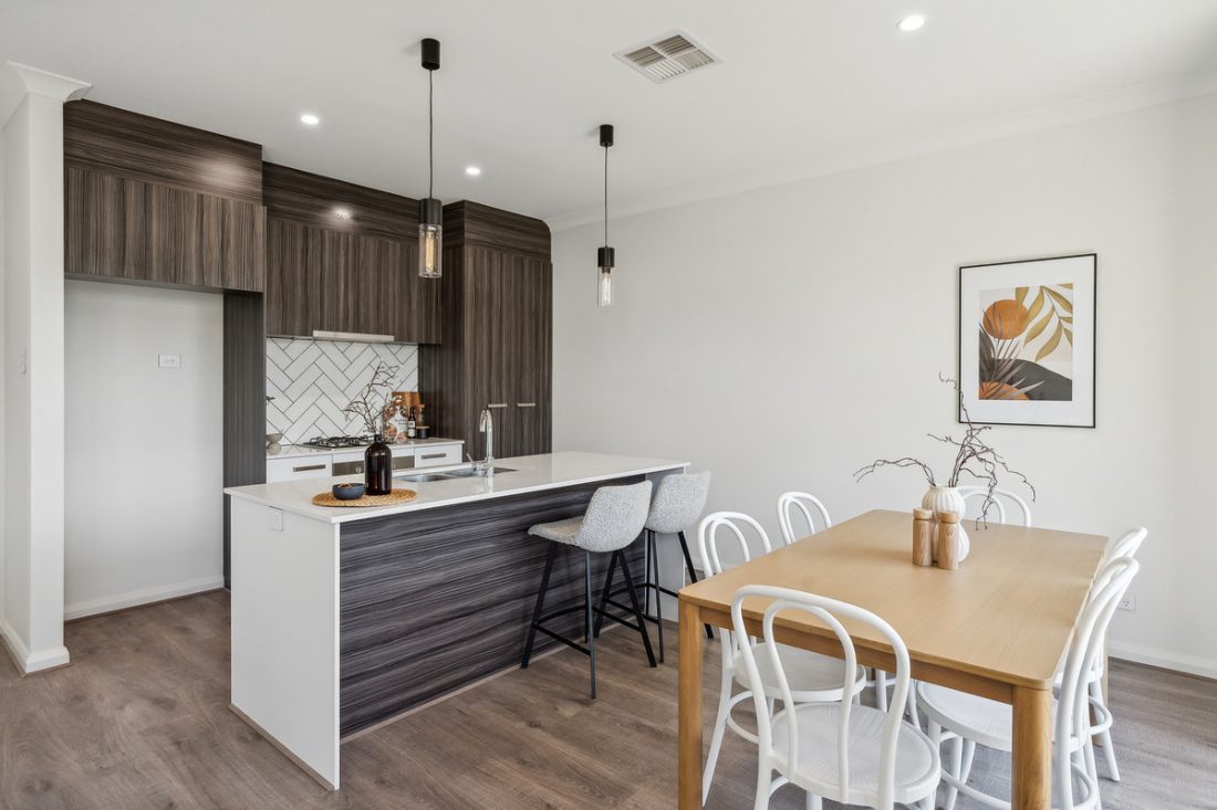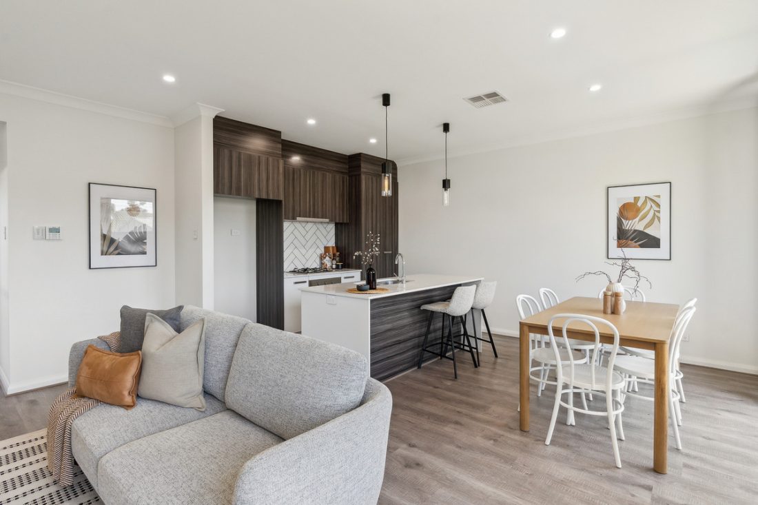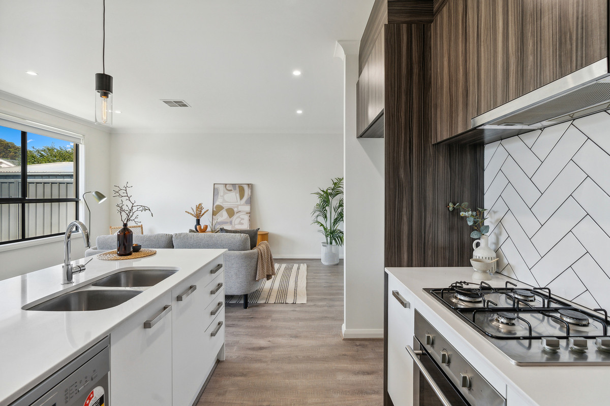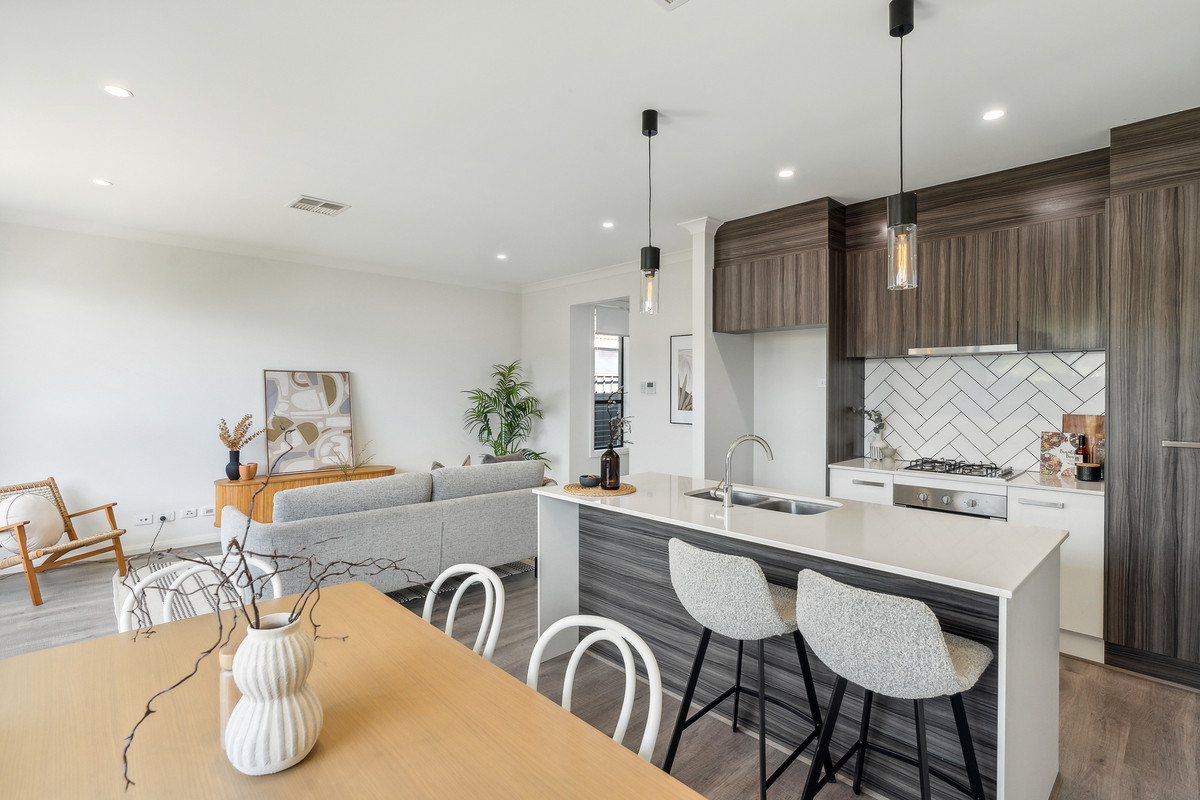 Step inside and follow the hallway into the heart of the home – a stylish open-plan kitchen, dining, and living area destined to be the central hub of everyday living. Bathed in natural sunlight, the modern kitchen boasts stone bench-tops and stainless-steel appliances, including a gas cooktop and dishwasher. Thoughtfully designed storage solutions maintain a clutter-free space, while a stylish island bench serves as both a versatile workspace and a gathering spot with room for stools.