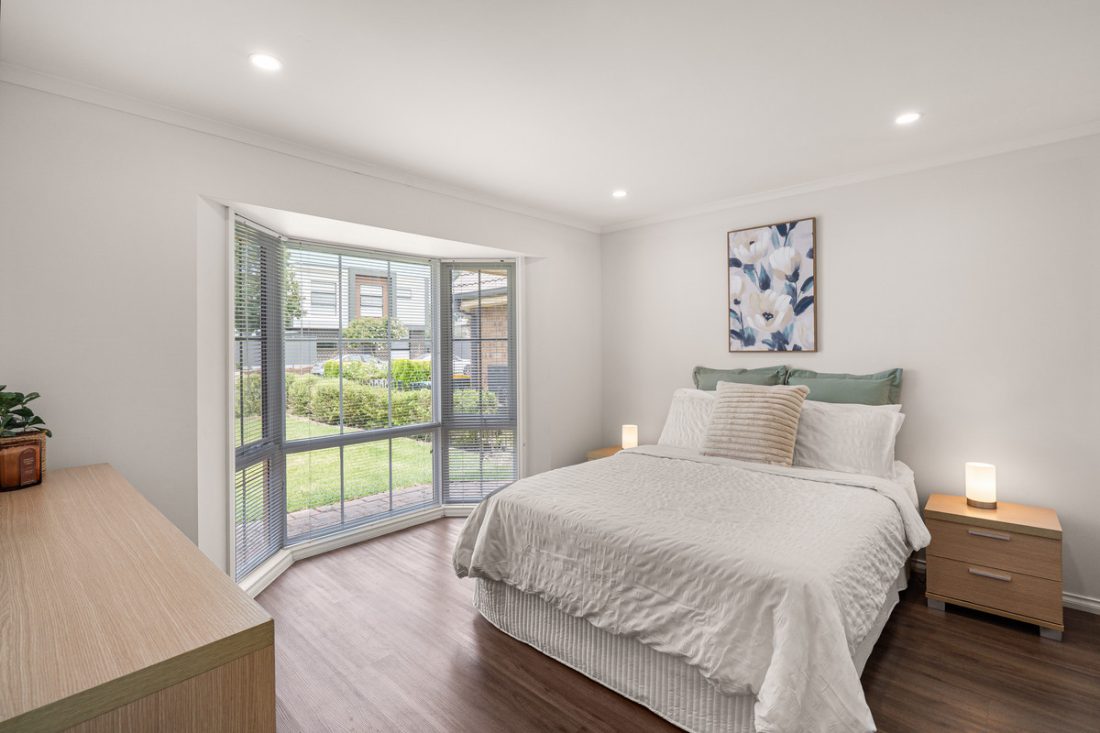 Back inside, the master bedroom sits at the front of the home and features its own bay window, a generous walk-in robe and direct sliding-door access to the main bathroom. Recently renovated, the bathroom showcases a large floating vanity, oversized shower and stylish large-format tiling. Two additional bedrooms are tucked away in their own private wing, each offering built-in robes and plenty of natural light.