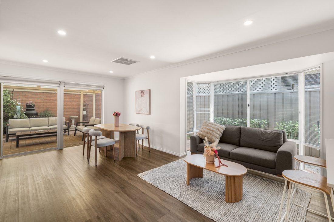 – Light-filled living and dining with bay window feature