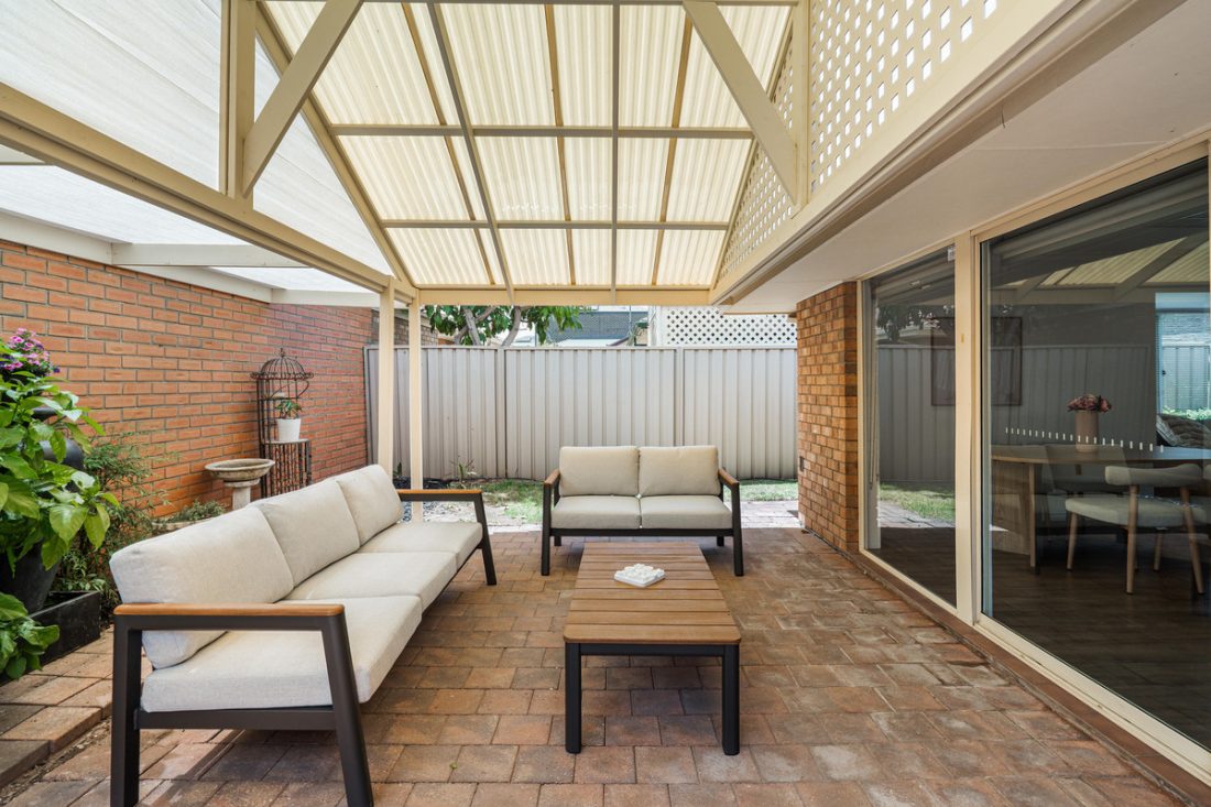 Glass sliding doors open from the living space to an undercover paved pergola, creating an easy indoor-outdoor connection that’s ideal for entertaining. Established lawn and greenery wrap the space, offering privacy and a relaxed outlook.