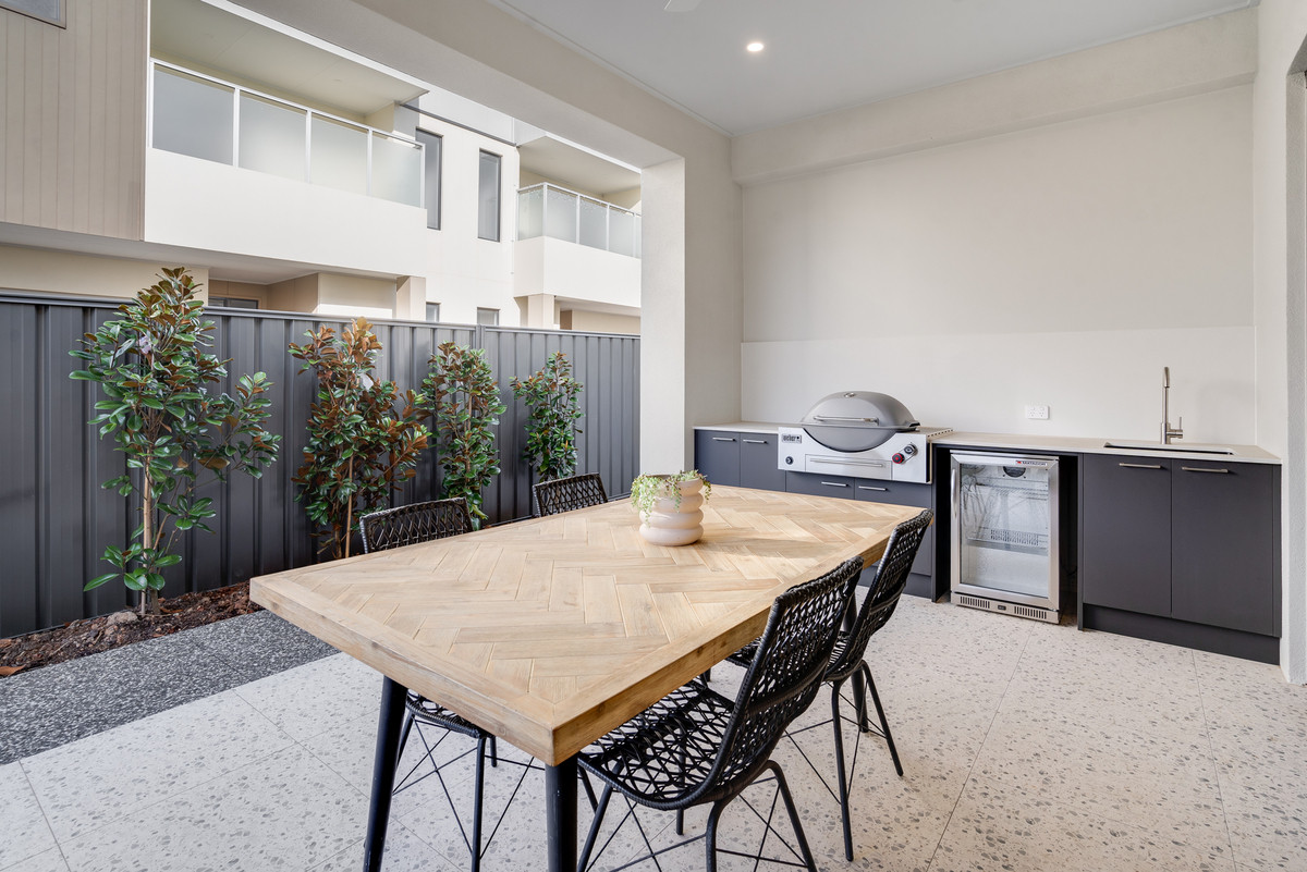 The living area continues the theme of effortless style, with built-in cabinetry and seamless access to the undercover outdoor entertaining area through expansive glass sliding doors. The outdoor space features a built-in BBQ with cabinetry, a sink, and ample room to host family and friends.