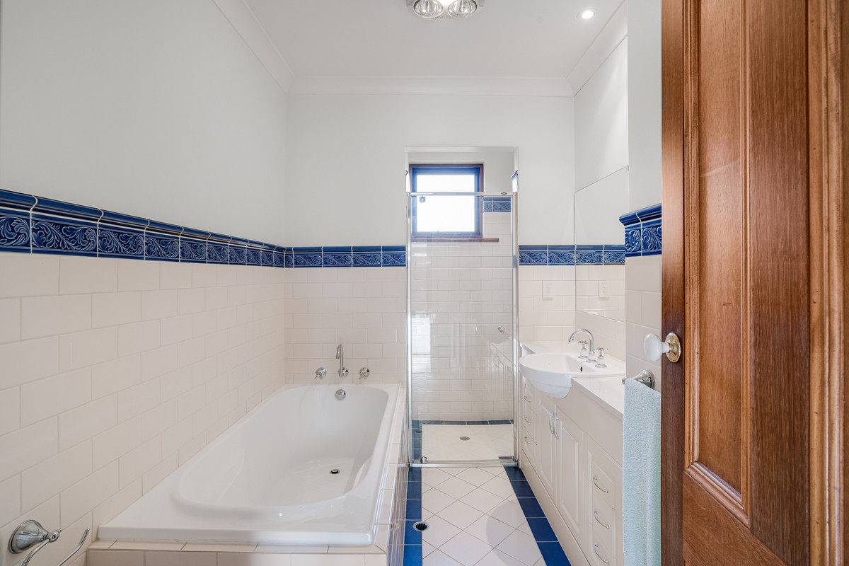 The stylish bathroom is a delightful retreat, featuring white tiling, plenty of natural light, and a large built-in bath, as well as a separate shower. Not to mention, this home is well appointed for the growing family with an additional separate toilet and extra shower for that added privacy!