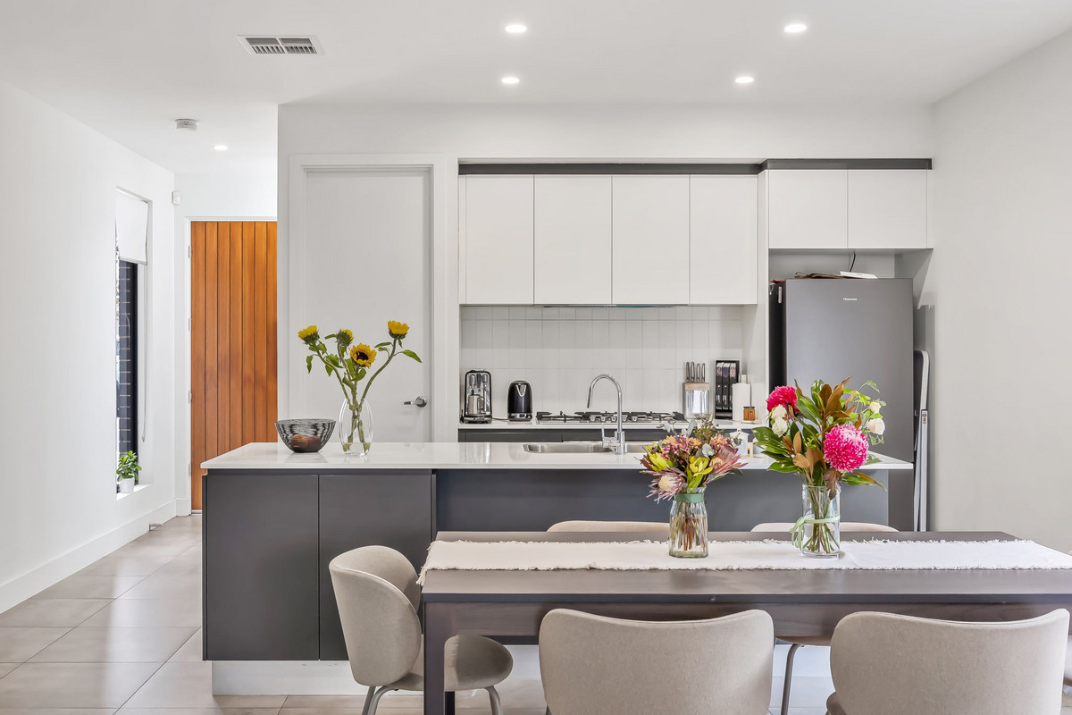 The open-plan living, dining, and kitchen zone is light-filled and practical, flowing seamlessly to a private courtyard that keeps maintenance low while maximising lifestyle. The kitchen is well-appointed with stainless steel appliances, gas cooking, a dishwasher, and plenty of storage including a walk-in pantry, while glass sliding doors connect you to your own private outdoor space.