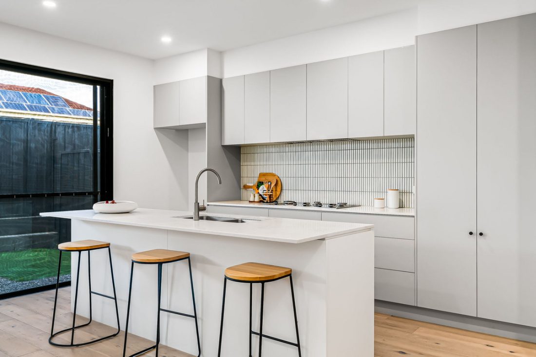 – Designer kitchen with stone bench-tops, tiled backsplash, sleek tap-ware and stainless steel appliances including gas cook-top