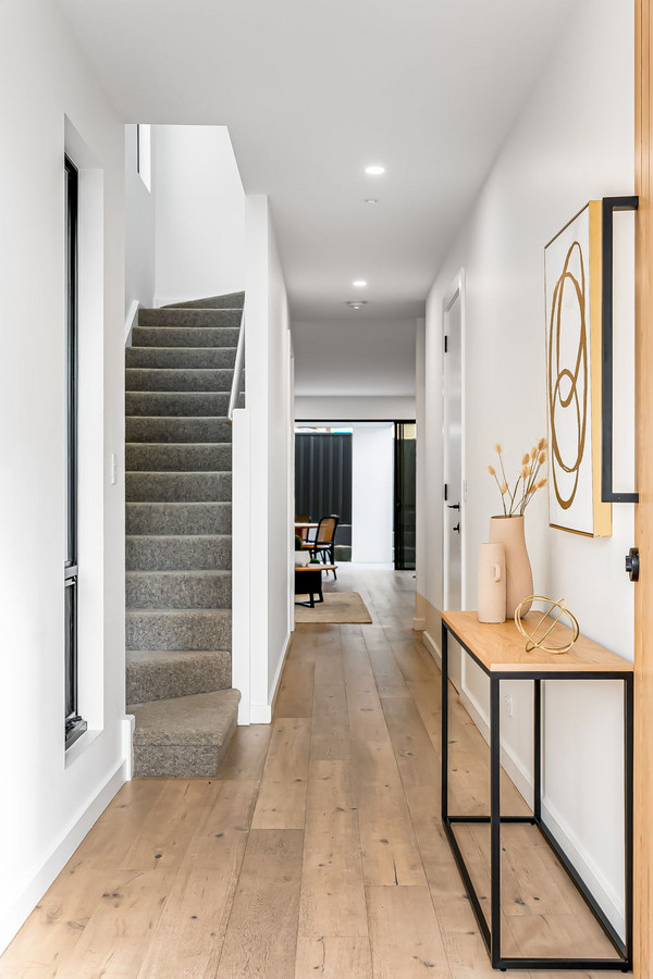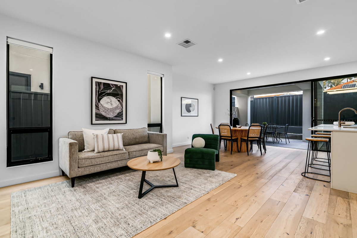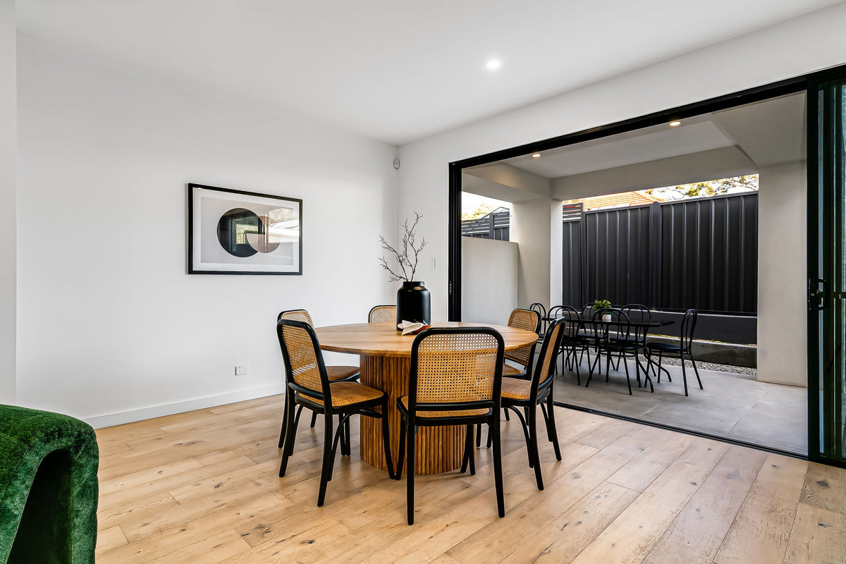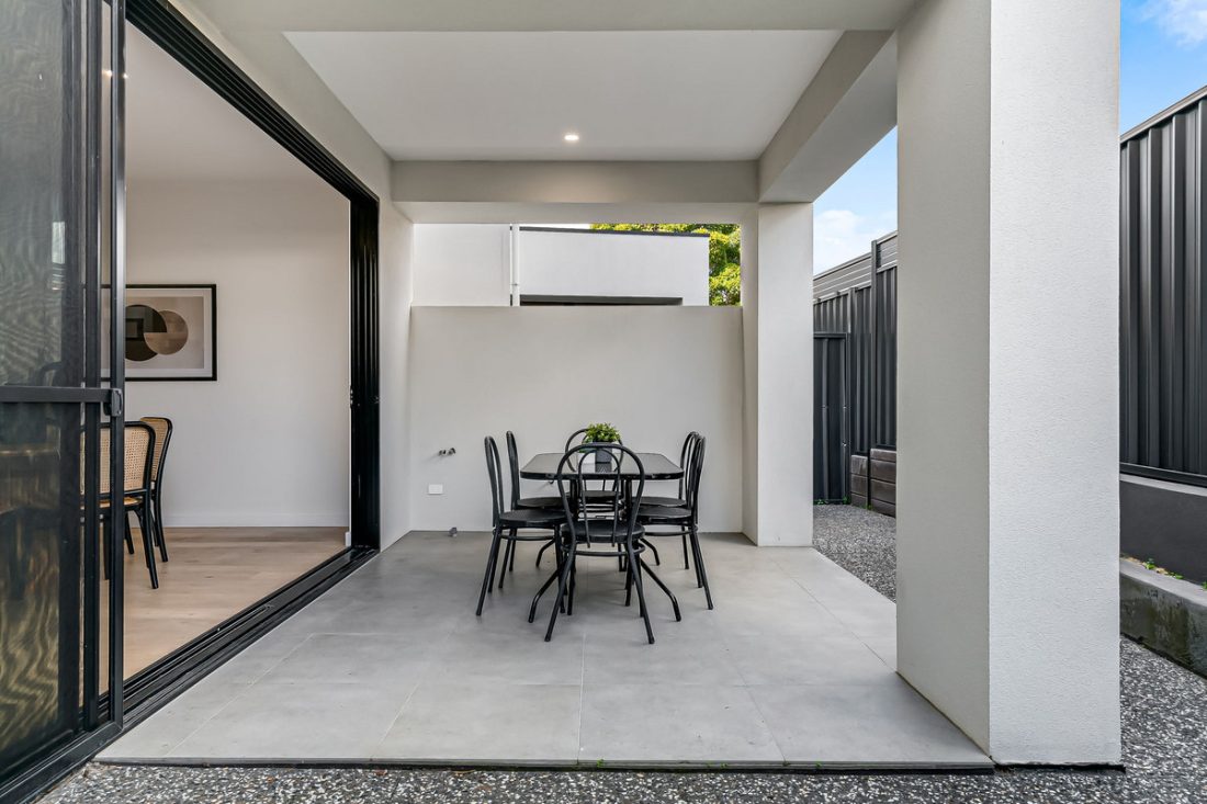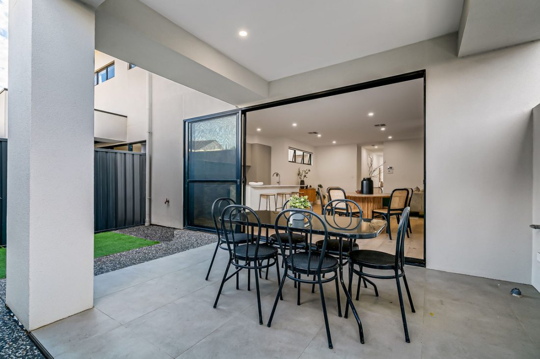 Sliding glass doors seamlessly extend the living space to the outdoors, where a delightful alfresco area with sleek downlights becomes a natural extension of the interior.