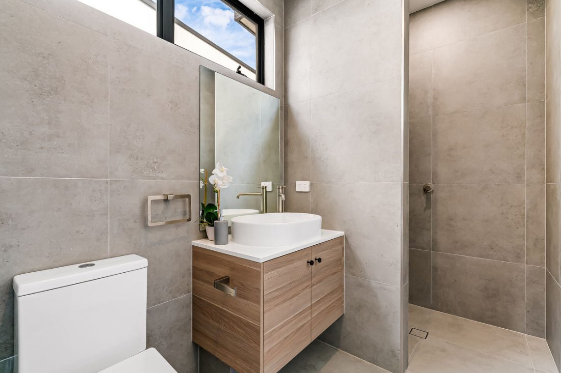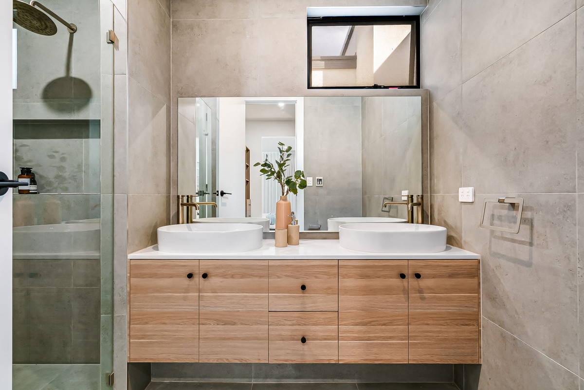 – Stone surfaces and floor-to-ceiling tiling to wet areas