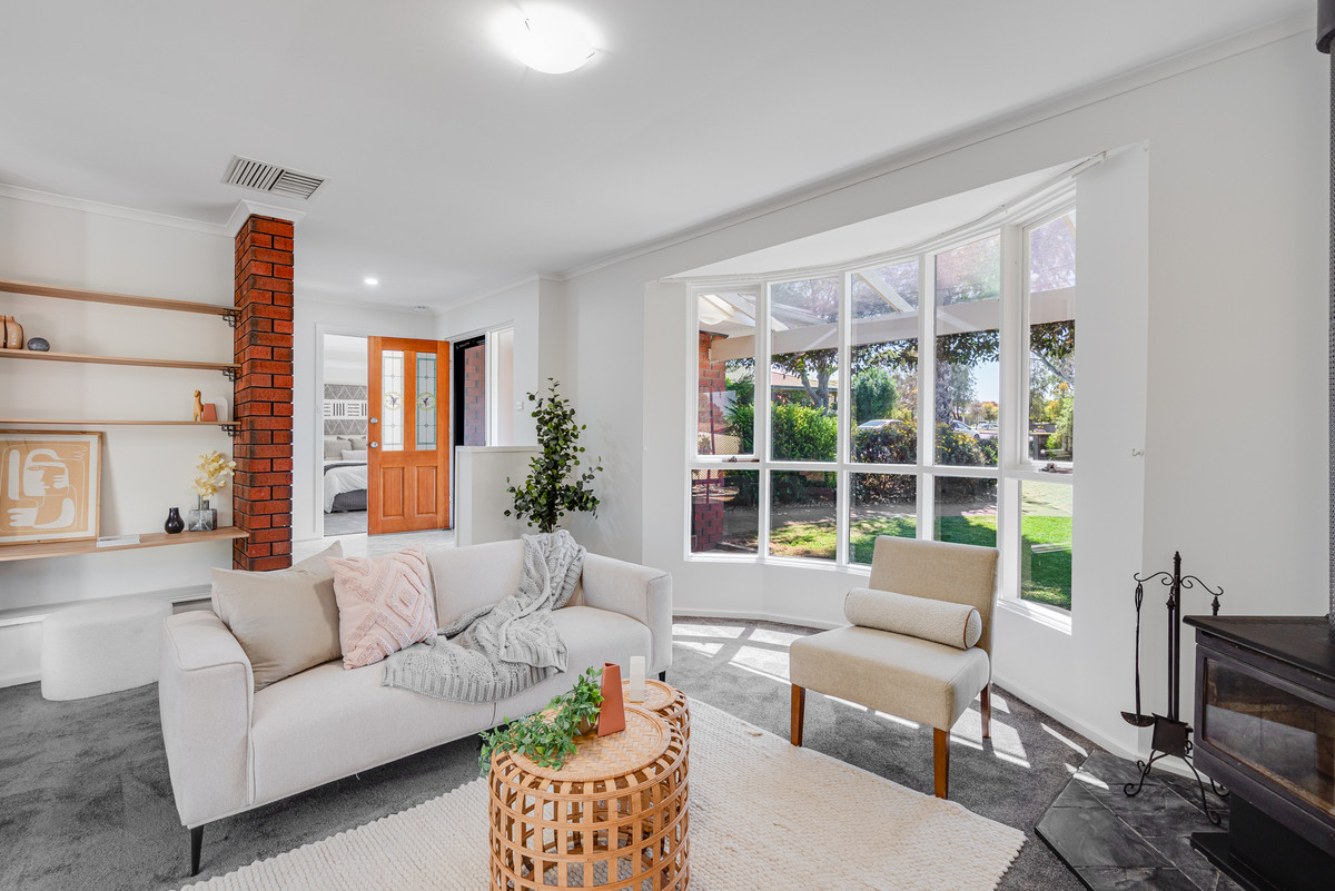 Step inside and be greeted by an inviting sunken lounge room, where a beautiful bay window allows ample natural sunlight to flood through. Plush carpet and a charming heater create a cozy space, perfect for movie nights. Flow through to the formal dining space, where another large window ensures a bright and welcoming space.