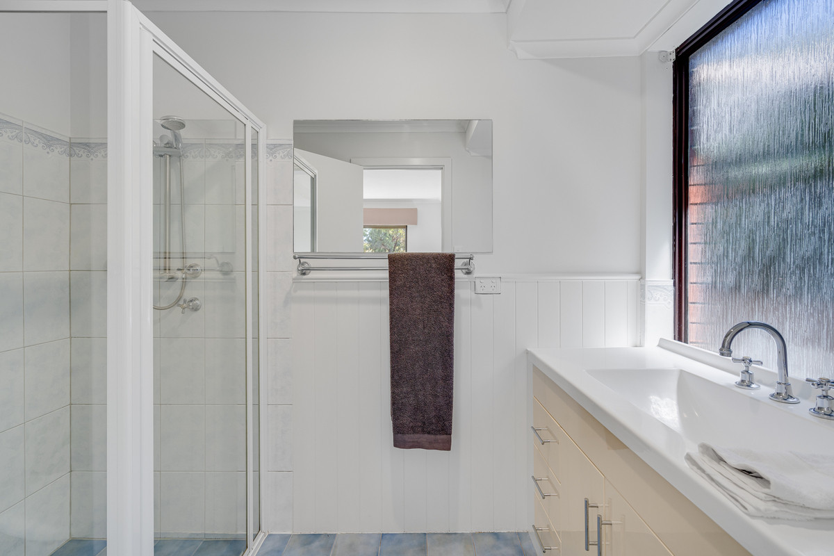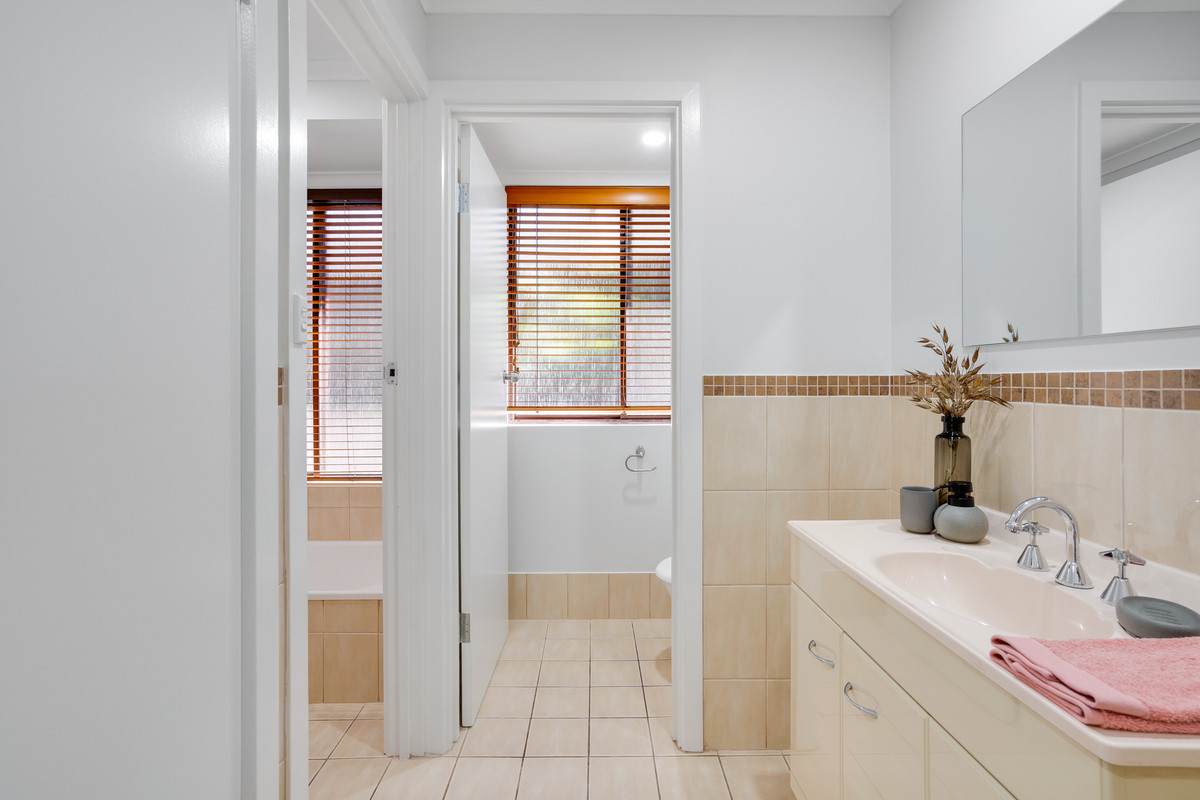 The charming bathroom offers a functional three-way layout with half walled tiling, a large vanity, a built-in bath, spacious shower, and a separate toilet. The ensuite is similarly spacious, featuring ample storage, shower and a toilet.