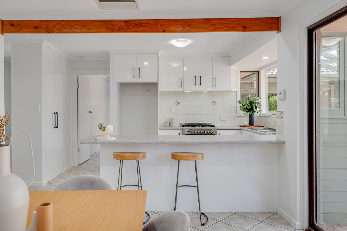 The open plan kitchen and family room can be accessed through here, the heart of the home. The beautifully renovated kitchen features ample bench space, tiled backsplash, stainless steel appliances including a gas cook-top, breakfast bar with room for bar seating and an oversized window that invites a leafy view in.