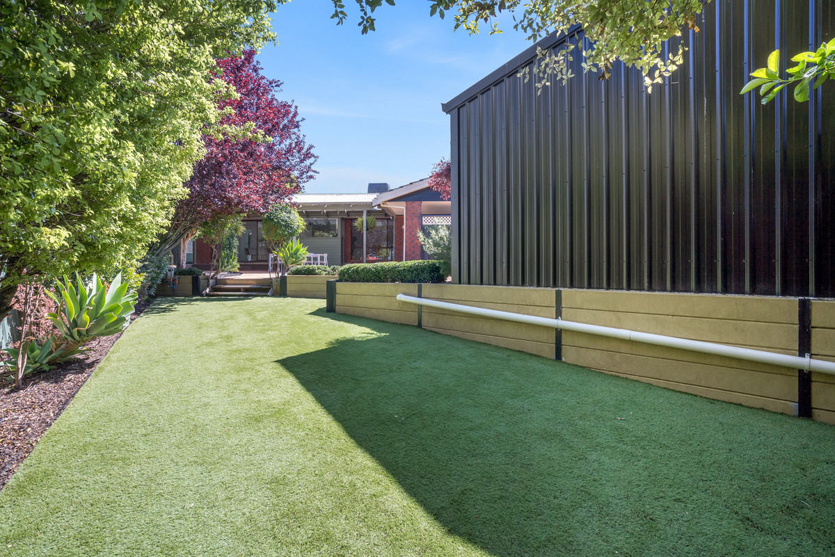 Glass sliding doors from the casual meals area invite the outdoors in, opening to a fantastic undercover alfresco space featuring a pitched pergola and beautiful established greenery. A generous stretch of lawn offers plenty of room for children and pets to play or for soaking up the sunshine, making this the ultimate summer hangout spot.