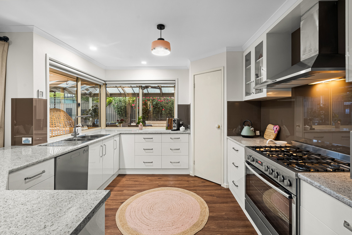The heart of the home opens up into the open plan kitchen, living and meals zone, light filled, inviting and designed for everyday living. The renovated kitchen offers generous bench space, a walk-in pantry and stainless steel appliances including an extra-wide gas cooktop and dishwasher. Large corner windows bring in beautiful natural light and create an easy connection to the outdoor entertaining area, keeping everything feeling open and connected.