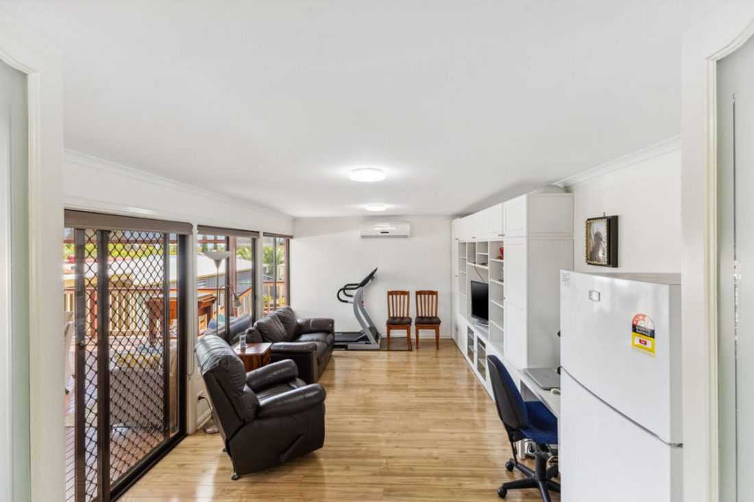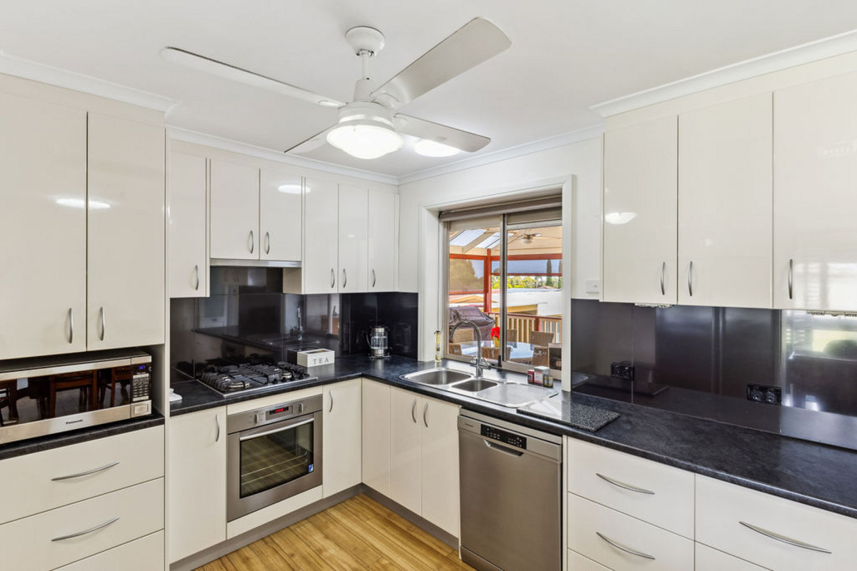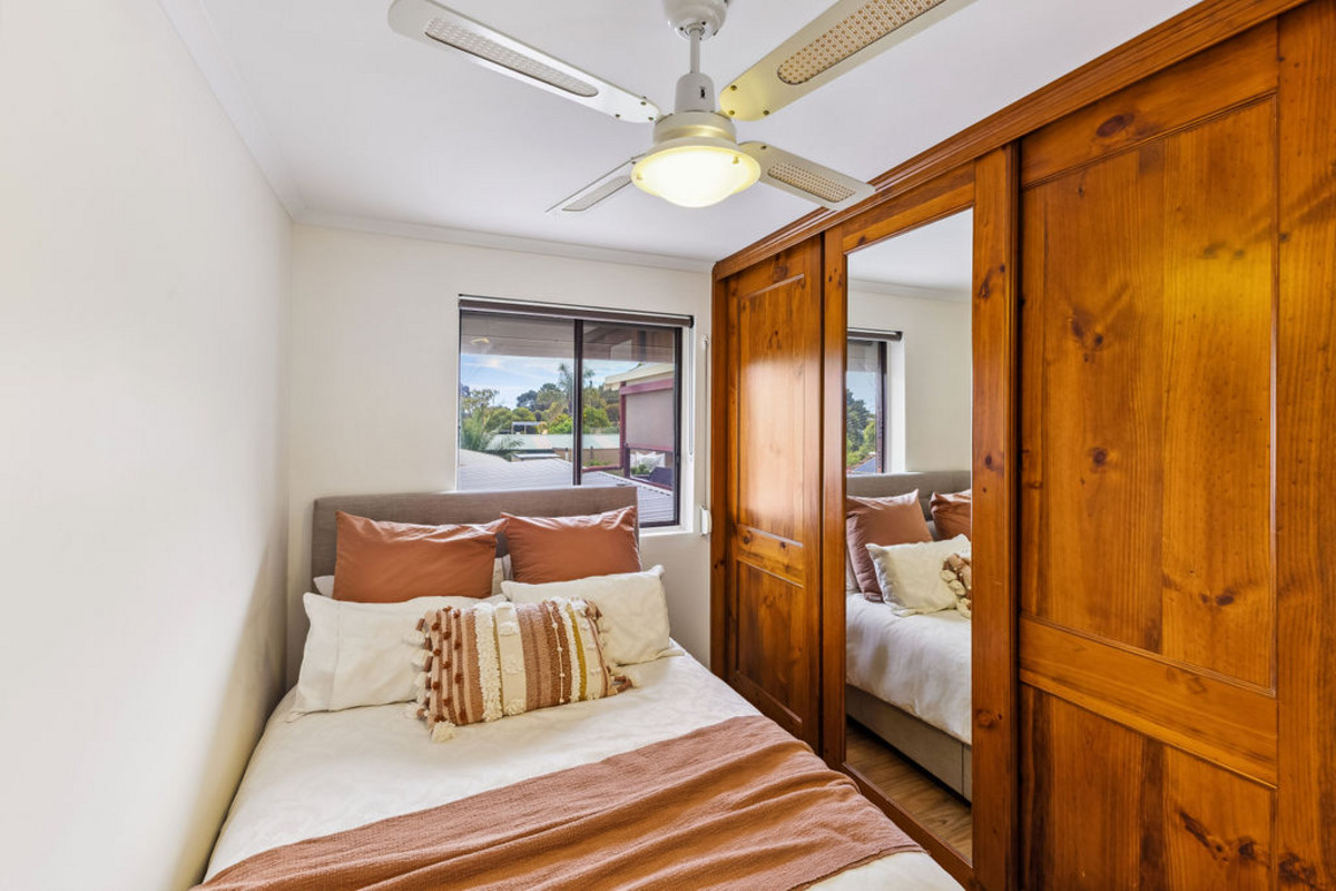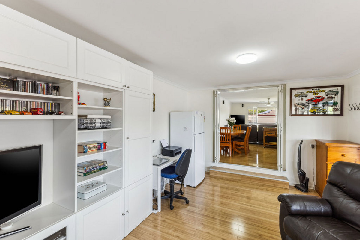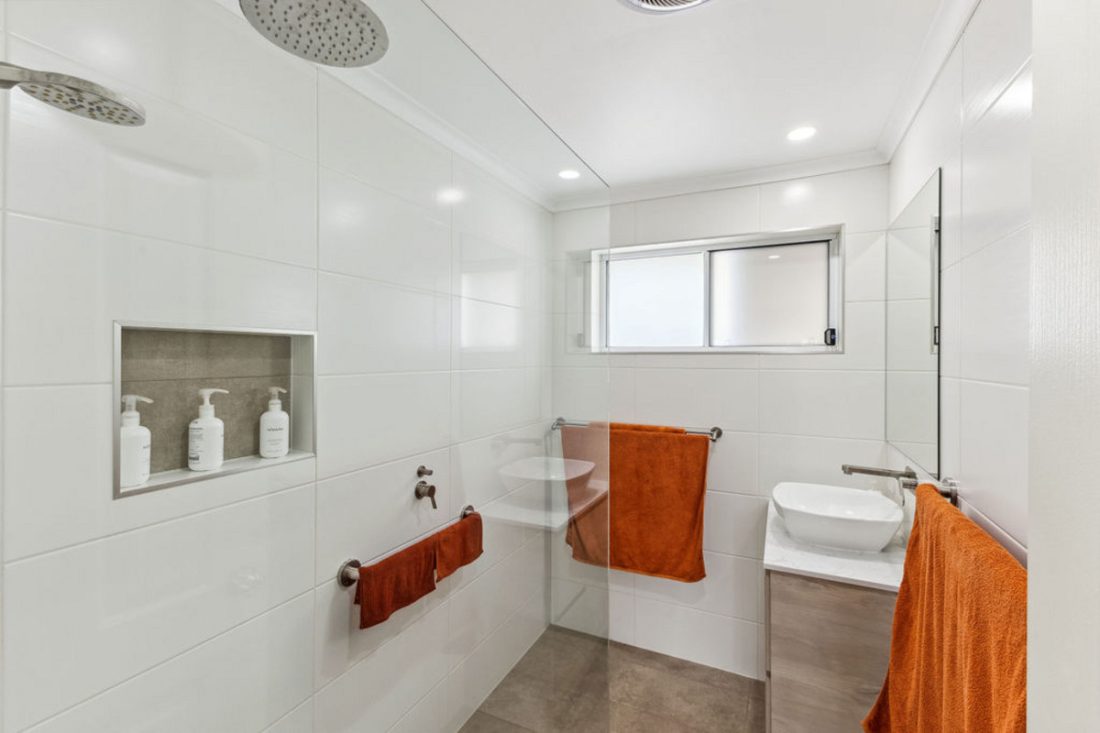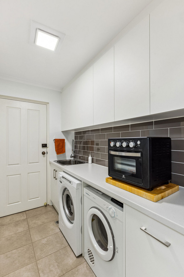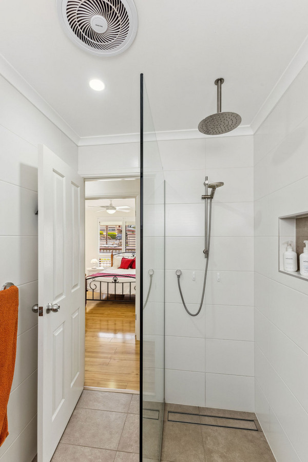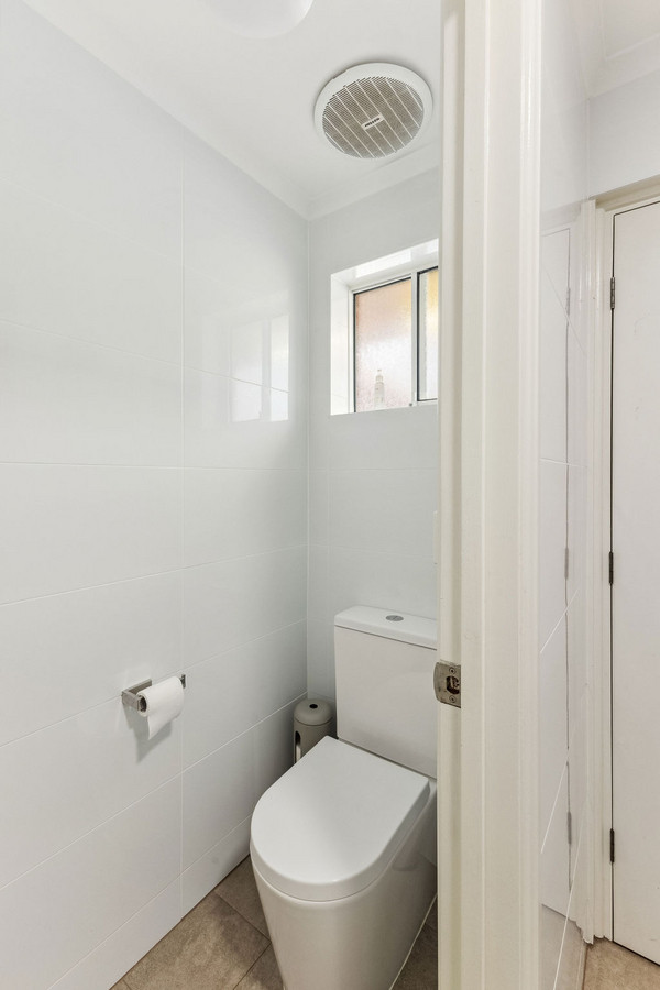 Back inside, all three bedrooms are equipped with built-in wardrobes and ceiling fans. The luxurious bathroom has been tastefully renovated with floor-to-ceiling tiles, a frameless walk-in shower, and a modern vanity, while a separate toilet adds extra convenience. A spacious laundry with ample storage completes the home’s functional layout.