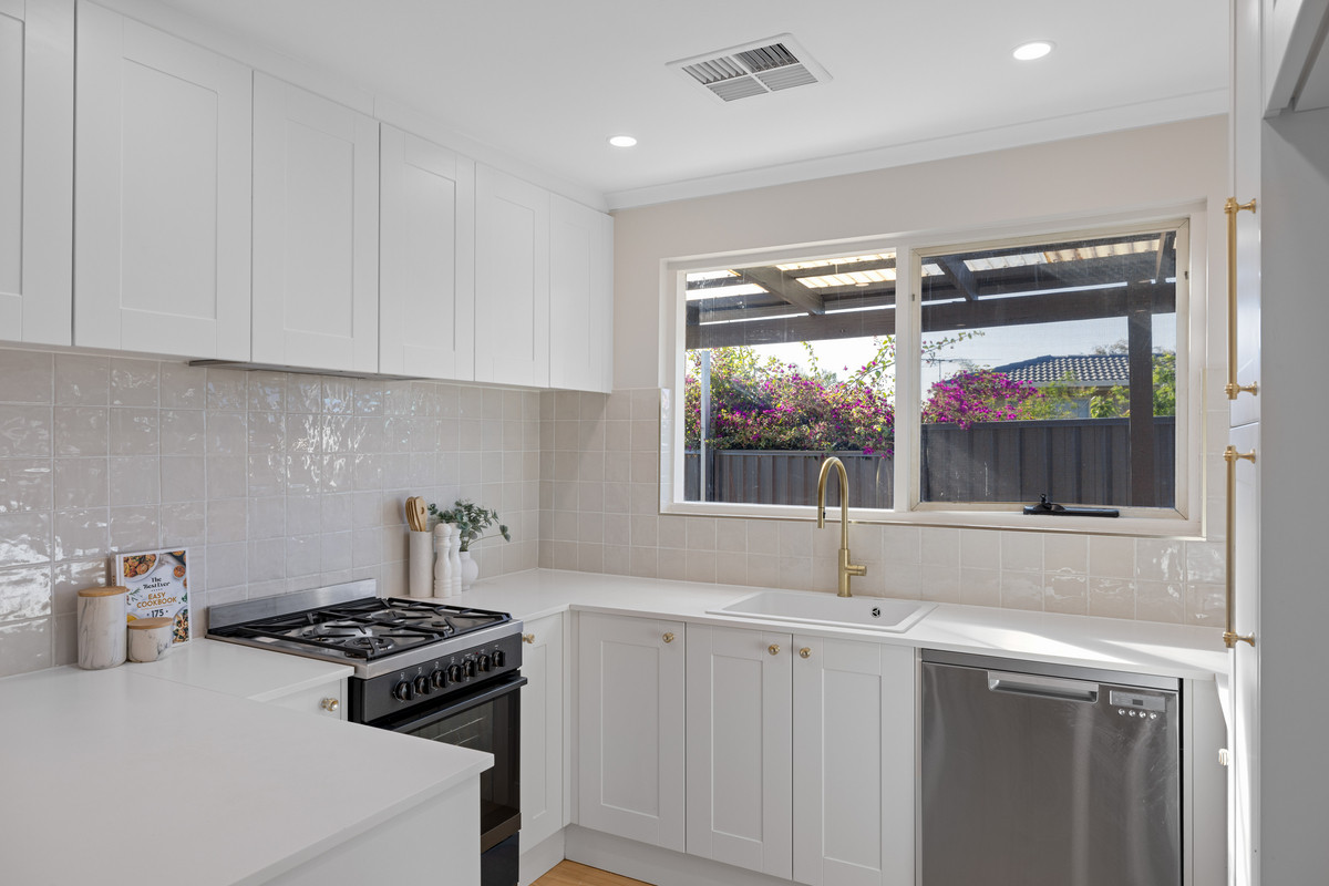 The brand-new kitchen is a true highlight, showcasing timeless white shaker-style cabinetry, stainless steel appliances, gold hardware, a modern tiled splashback, and generous bench space — ideal for both casual breakfasts at the bar and hosting friends for dinner.