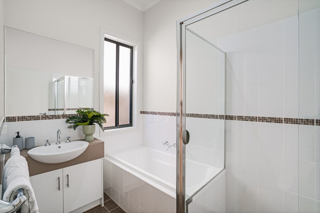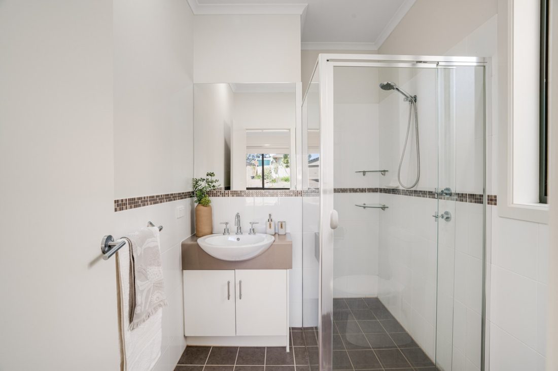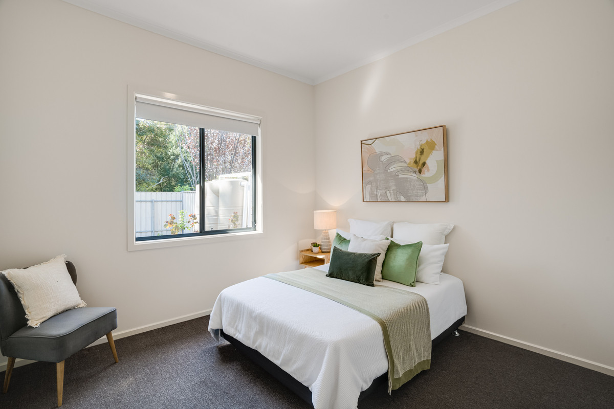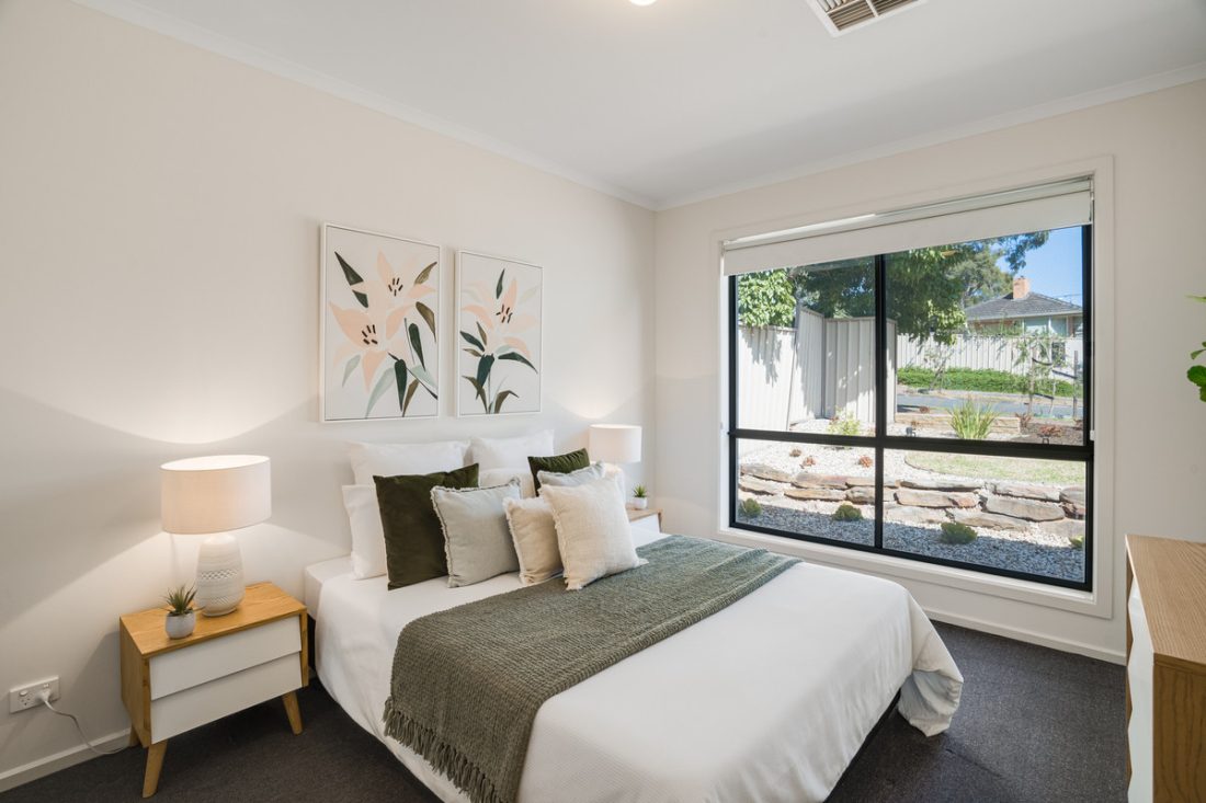 Two spacious bedrooms can be found in the side wing of the home, each adorned with plush carpeting and ample natural light. The master bedroom, positioned at the front of the house offers a private retreat with a walk-in robe and ensuite. Both bathrooms offer a simple yet luxurious experience, ideal for unwinding and rejuvenating. Thoughtfully designed, the main bathroom includes a built in bath, shower, and a separate water closet for added convenience.
