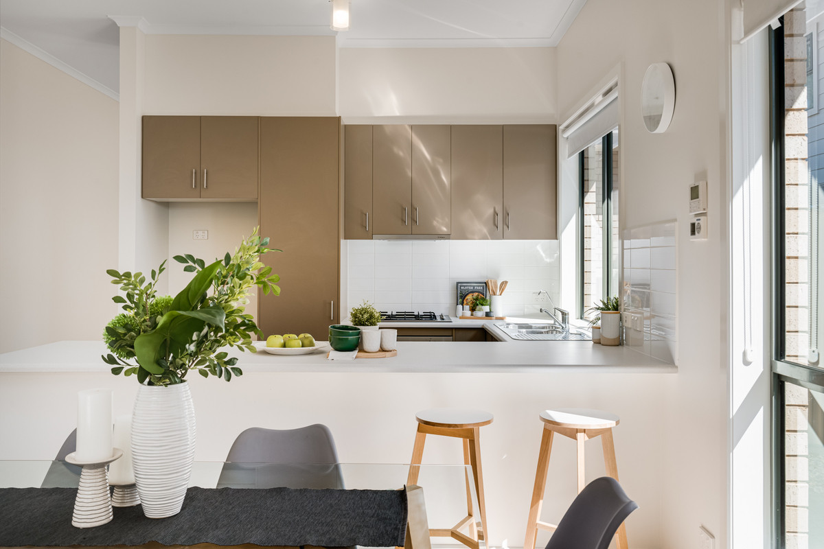 Bathed in natural sunlight, the modern kitchen impresses with its gas cook-top and stainless-steel appliances, including a dishwasher. Abundant bench space and storage ensure a clutter-free and functional workspace. With room for up to 6 bar stools, this becomes the perfect gathering spot for family moments.